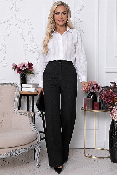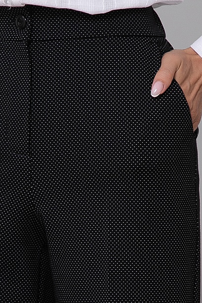 * Брюки из плотного хорошо держащего форму жаккардового трикотажного полотна черного цвета в мелкую крапинку.(ткань производство Турция) с заутюженными стрелками. Брюки с высокой посадкой по талии  застегивающиеся на молнию в гульфике. Пояс притачной с застежкой на пуговицу. Для удобства в носке пояс по спинке собран на резину. По бокам подрезные функциональные карманы.