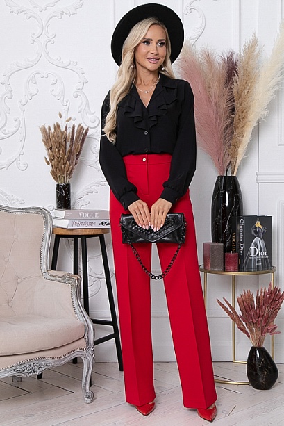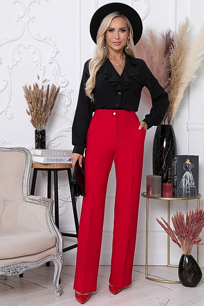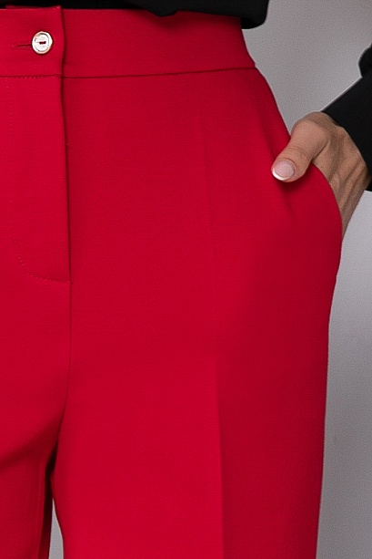 * Брюки из плотного хорошо держащего форму жаккардового трикотажного полотна  с заутюженными стрелками. Брюки с высокой посадкой по талии  застегивающиеся на молнию в гульфике. Пояс притачной с застежкой на пуговицу. Для удобства в носке пояс по спинке собран на резину. По бокам подрезные функциональные карманы.