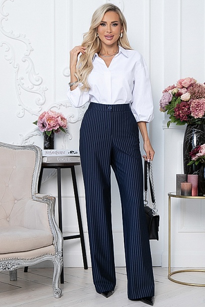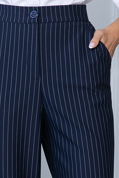 * Брюки из плотного хорошо держащего форму  трикотажного полотна в полоску, с высокой посадкой по талии  застегивающиеся на молнию в гульфике. Пояс притачной с застежкой на пуговицу. Для удобства в носке пояс по спинке собран на резину. По бокам подрезные функциональные карманы