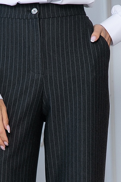 * Брюки из плотного хорошо держащего форму  трикотажного полотна в полоску, с высокой посадкой по талии  застегивающиеся на молнию в гульфике.Пояс притачной с застежкой на пуговицу.Для удобства в носке пояс по спинке собран на резину.По бокам подрезные функциональные карманы.