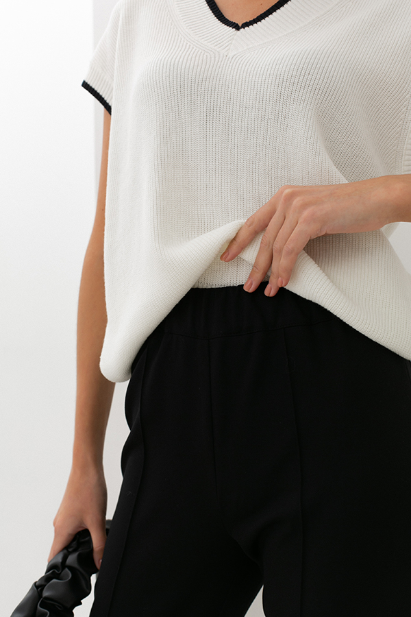 Брюки прямого силуэта, зауженные книзу, с разрезами в боковых швах выполнены из эластичного полотна. На передней части брюк застрочены стрелки. Пояс притачной с эластичной резиной.