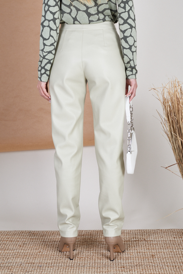 Брюки из эластичного полотна, с покрытием, имитирующим кожу, зауженные книзу. На передней части брюк карманы с подкройным бочком. Притачной пояс, застёжка на металлическую молнию-гульфик и кнопку.