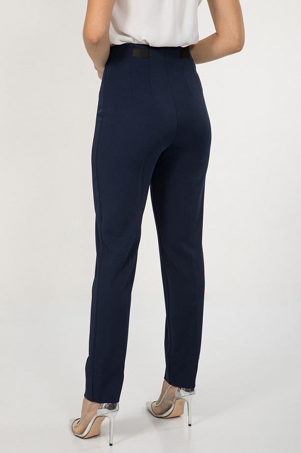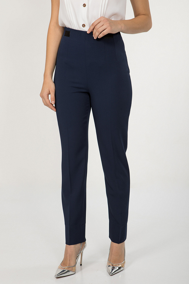 Брюки из текстильного полотна, полуприлегающего силуэта, слегка зауженные к низу, с высокой посадкой, без пояса.
