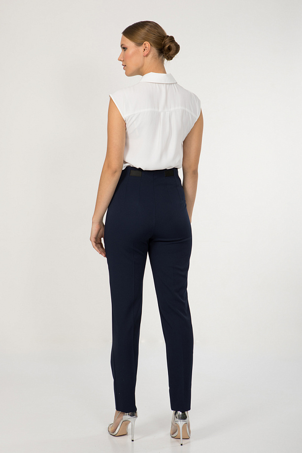 По линии талии между вытачками спереди и сзади брюки декорированы репсовой лентой. Низ изделия с широкой подгибкой.