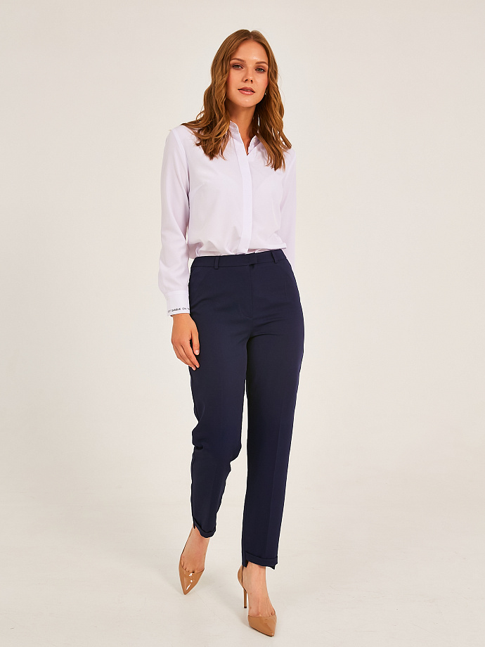Передние половинки брюк с подрезными бочками, состоящими из трех частей и декорированными отделочными строчками. На задних половинках имитация прорезных карманов в рамку. Низ брюк спереди с отворотом, разноуровневый, длиннее сзади.