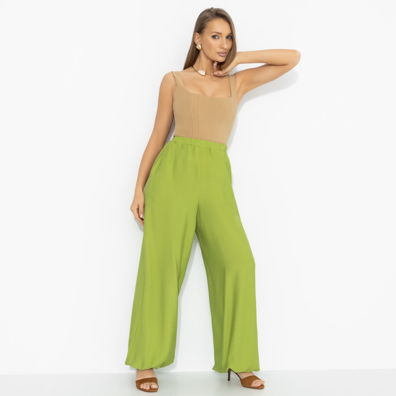 Цвет фисташковой пасты, молодой листвы и лаймового сорбета работает как магнит: стой, смотри. Свободный крой и высокая посадка брюк от ЧАРУТТИ вытягивают силуэт, они струятся при каждом шаге. Вискоза с нейлоном гладкая, прохладная к коже, мягко течёт и держит форму. Как будто ты только что вышла из коллекции resort 2026 и шагнула навстречу итльянскому лету. Брюки с карманами на резинке.