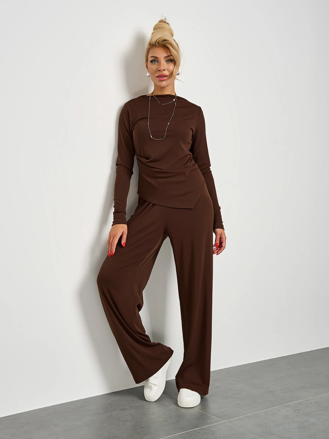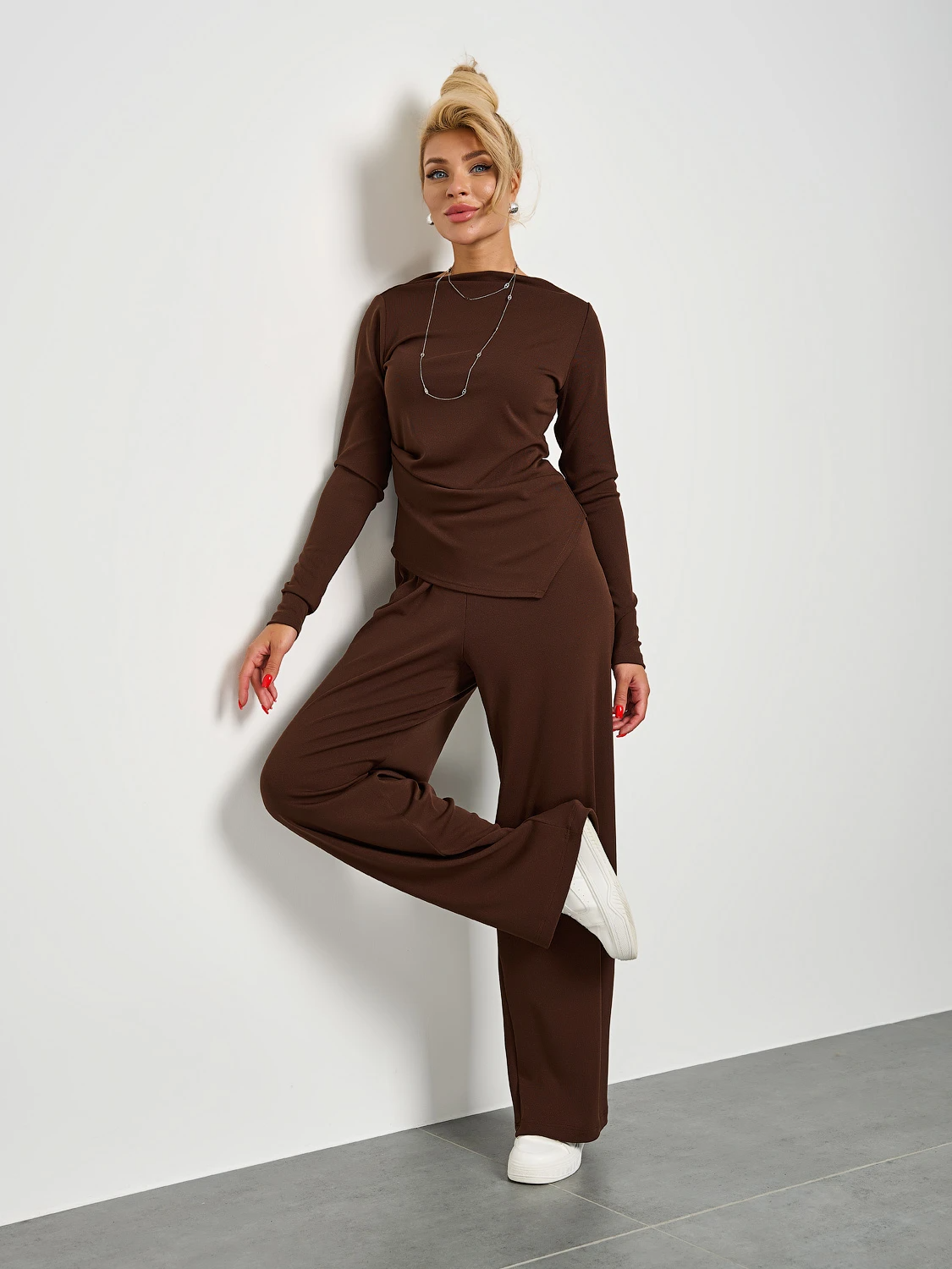 Широкие брюки трендового коричневого цвета из трикотажа.