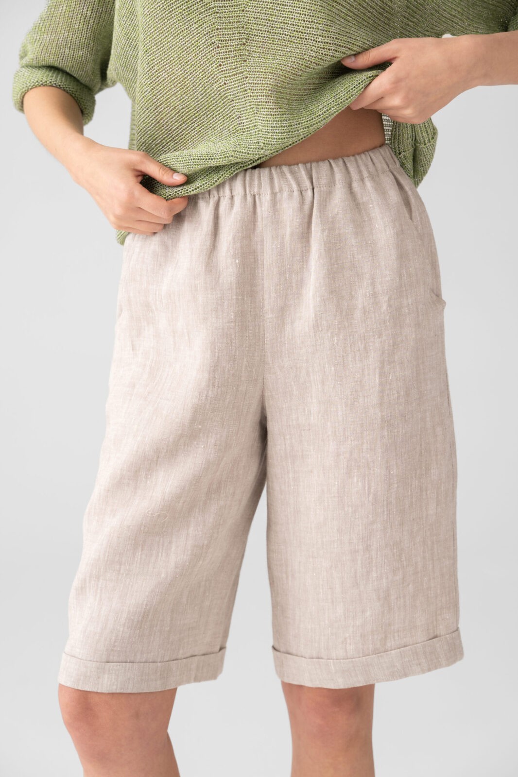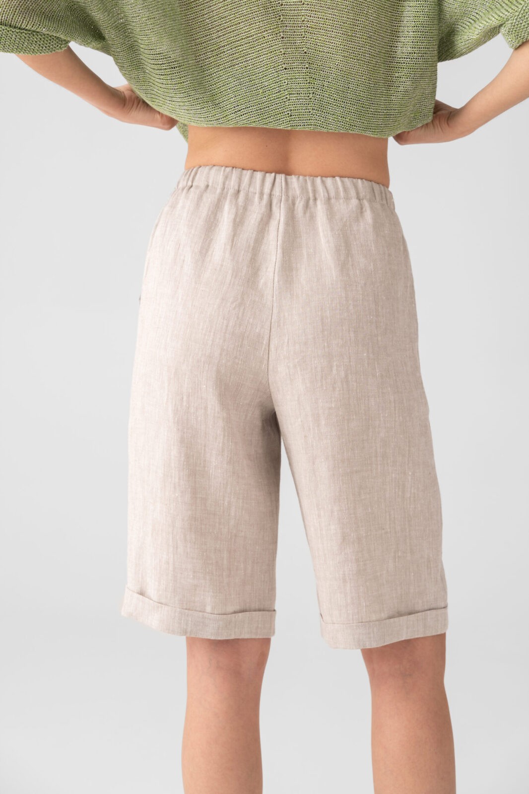 Шорты женские прямые, до колена. Карманы в отрезном бочке. Пояс цельнокроеный на резинке. По низу цельнокроеные манжеты.