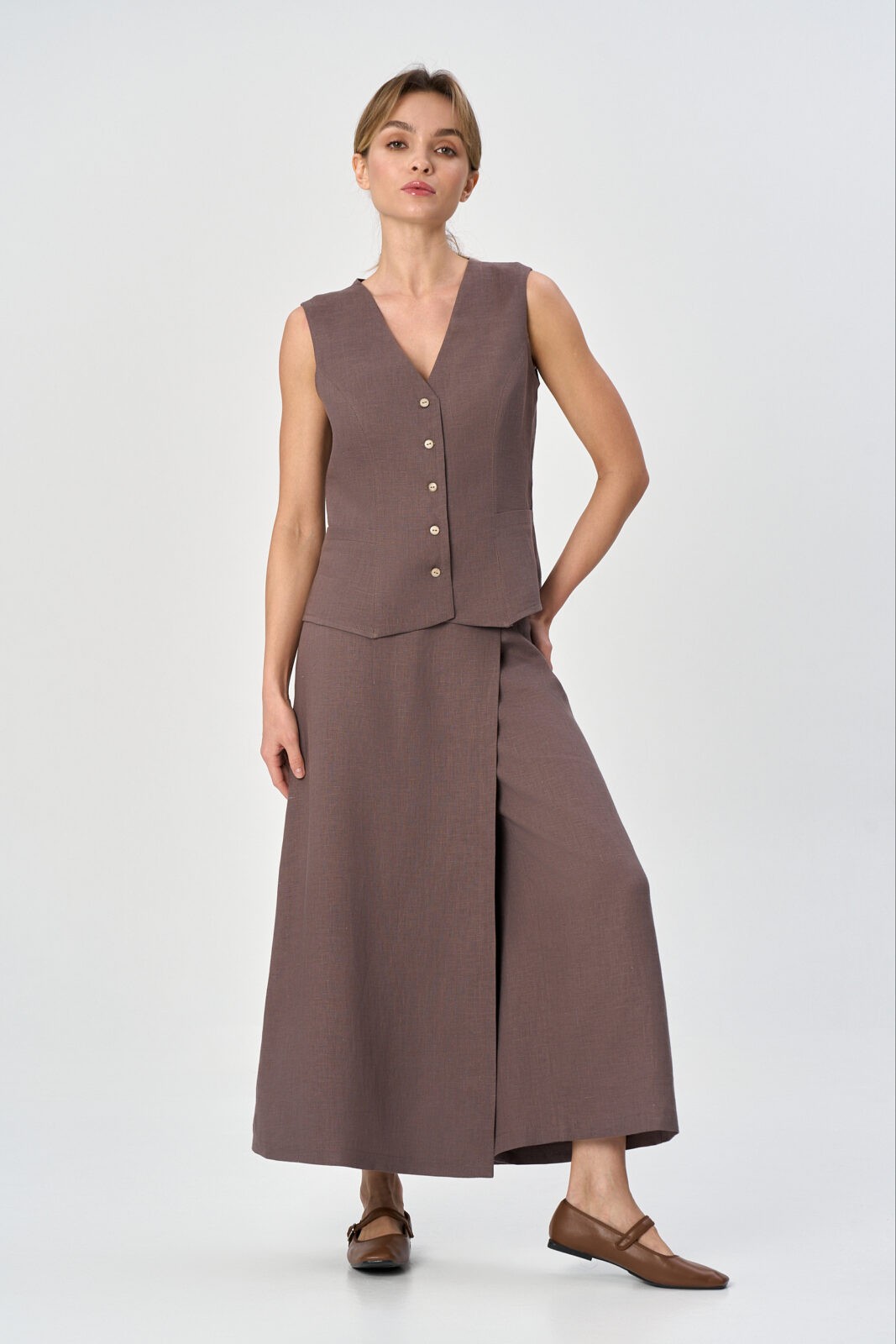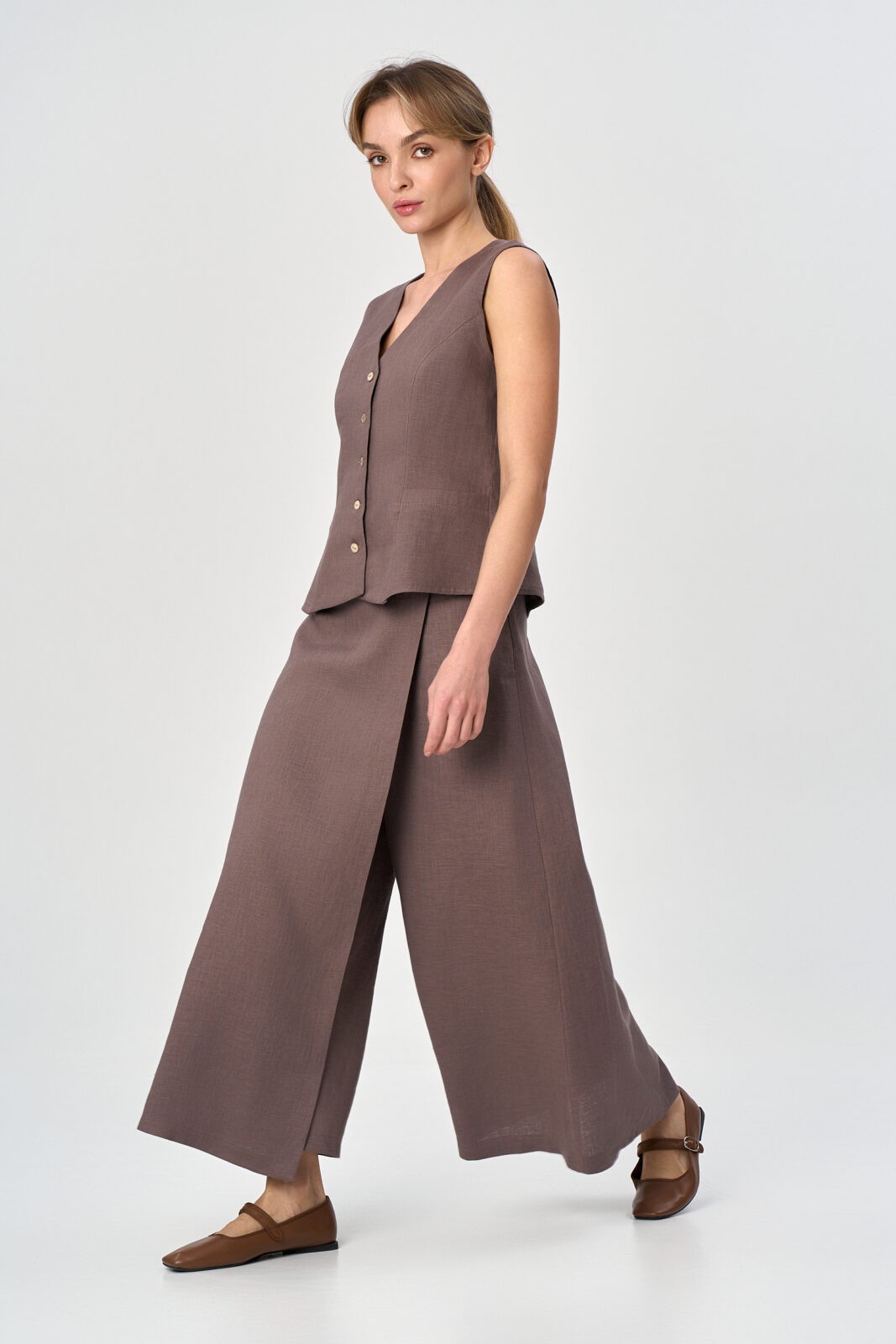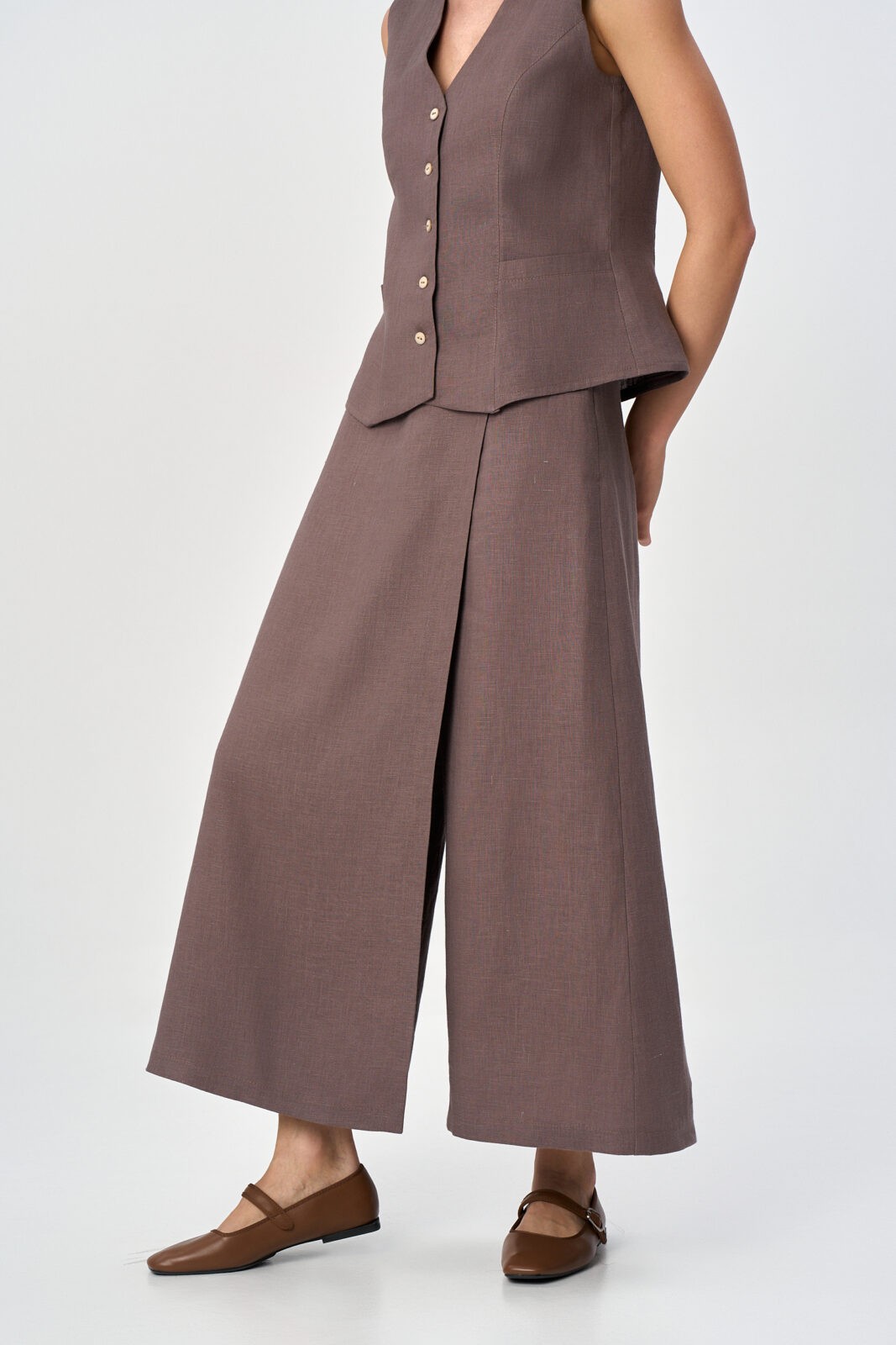 Юбка – брюки с запахом по переду и сзади. А-образного силуэта. Длина брюк 7/8. Застежка на потайную тесьму-молнию в левом боку. Пояс притачной с резинкой  по бокам.