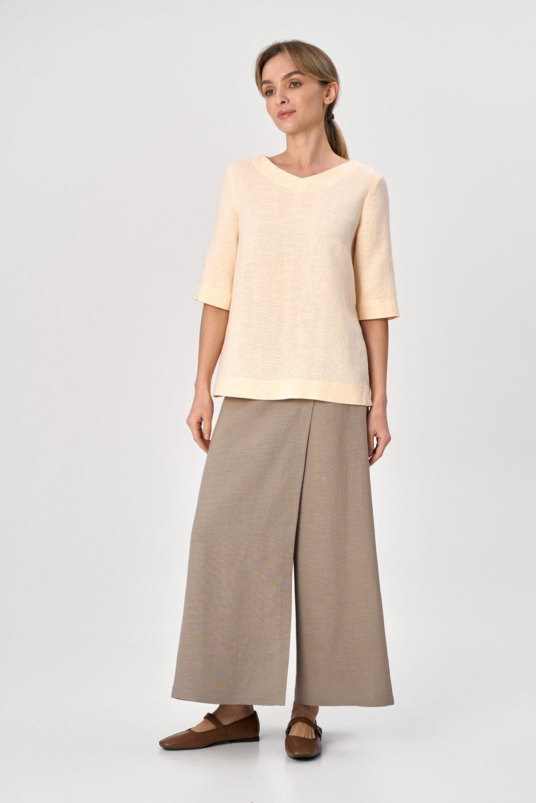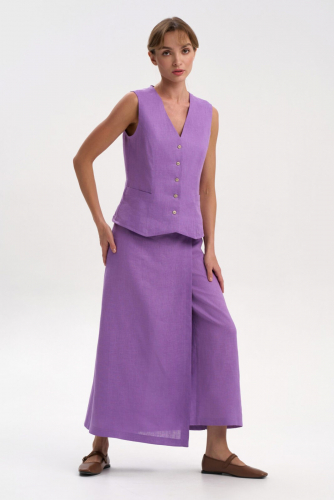 Юбка – брюки с запахом по переду и сзади. Состав ткани 50% лён, 50% вискоза.  А-образного силуэта. Длина брюк 7/8. Застежка на потайную тесьму-молнию в левом боку. Пояс притачной с резинкой по бокам.