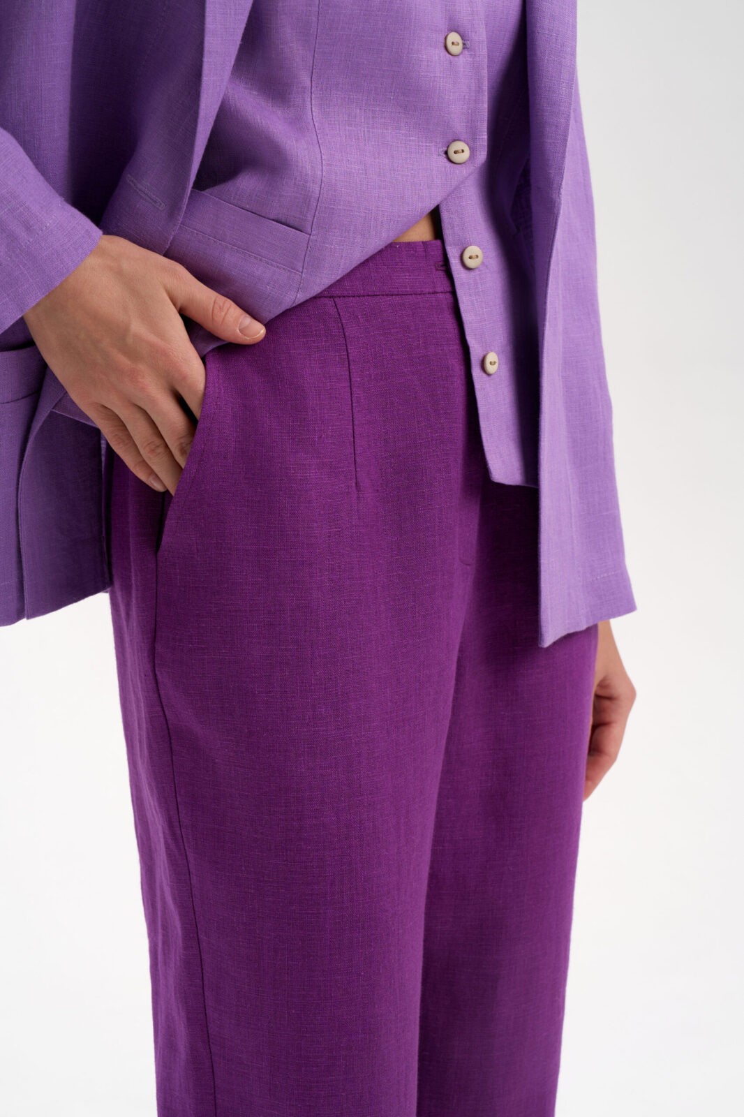 Брюки женские укороченные, зауженные к низу. Пояс притачной с  эластичной тесьмой по бокам. Застежка гульфик на молнии. Карманы в отрезном бочке.