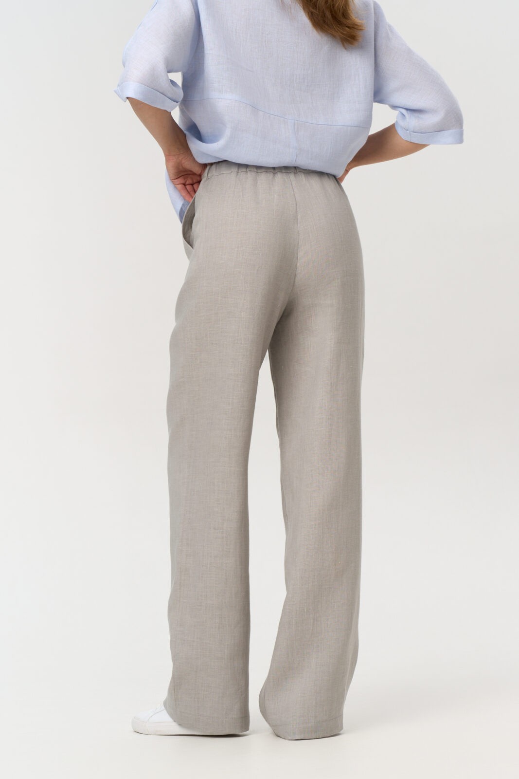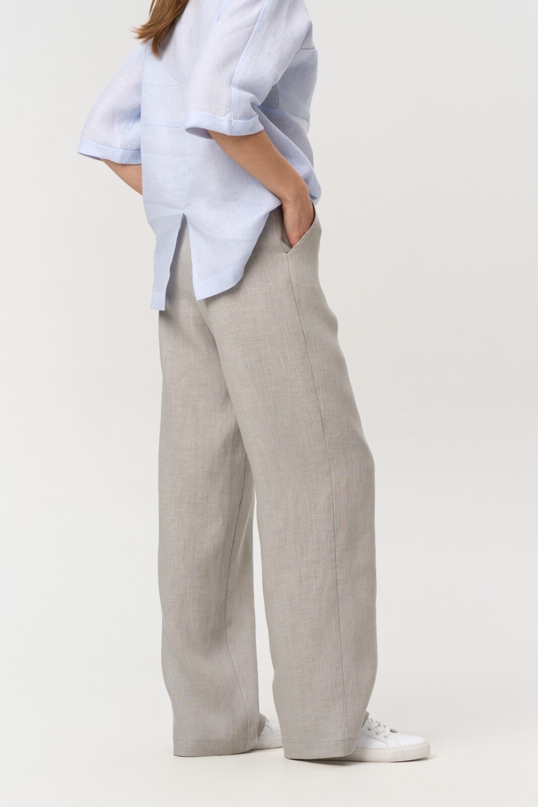 Брюки женские прямые. Пояс притачной с резинкой. Застежка гульфик на молнии. Боковые карманы в отрезном бочке.
