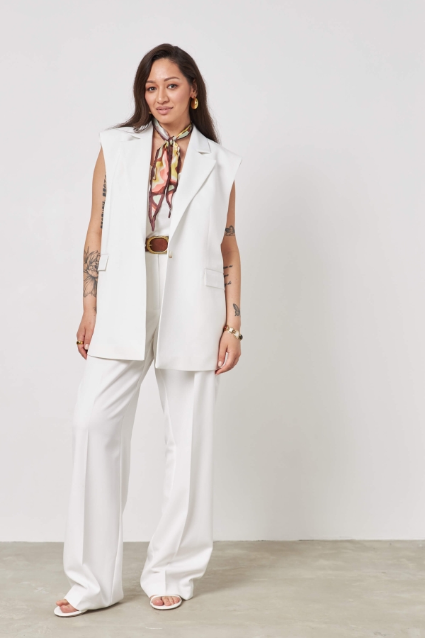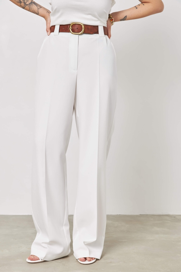 Брюки прямые широкие со стрелками, пояс на резинке, застежка на молнию и пуговицы, с боковыми карманами.