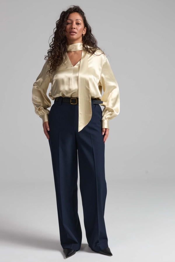 Брюки прямые широкие со стрелками, пояс на резинке, застежка на молнию и пуговицы, с боковыми карманами.