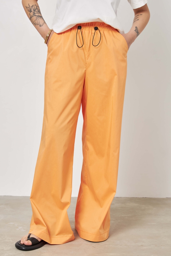 Брюки широкие с поясом на резине и фиксаторами, по переду боковые карманы.