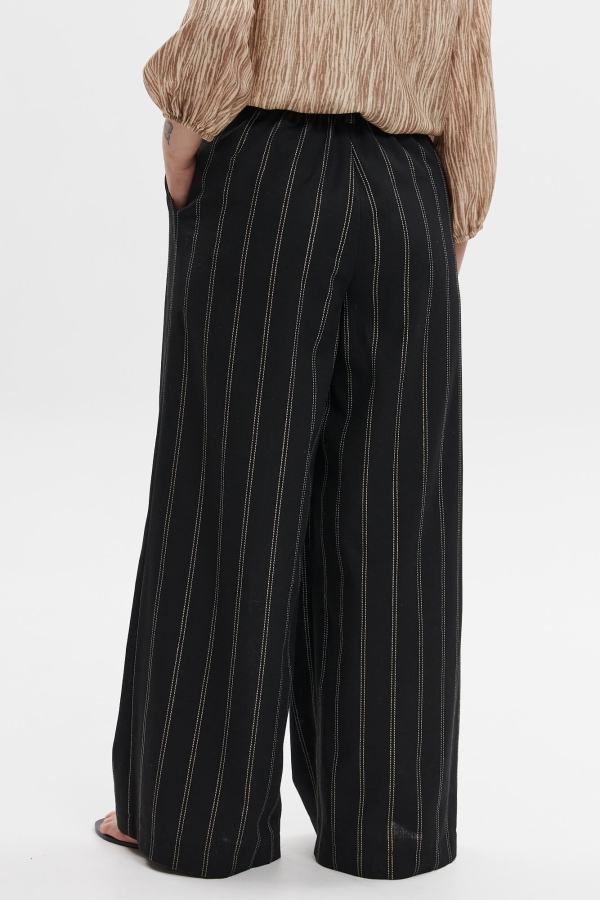 Брюки широкие с поясом на резинке и завязками. По переду боковые карманы. В составе полотна присутствует декоративная металл. нить.