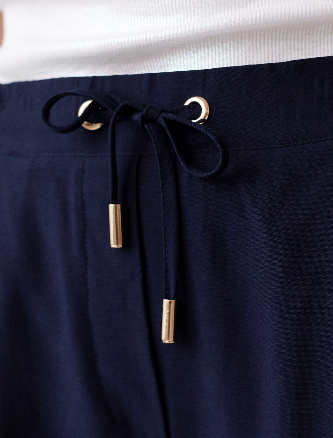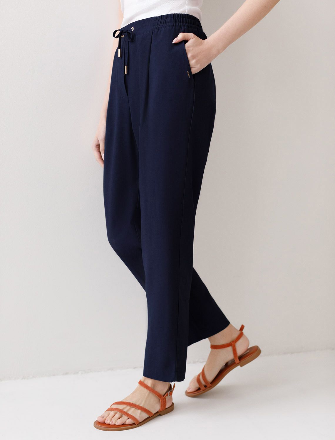 Брюки бананы темно-синего цвета выполнены из плотного лиоцелла. Лиоцелл это более дорогой и экологичный вариант вискозы, очень прочный и шелковистый. Модель отличается свободным кроем в бедрах и заужены к щиколотке. Удобный пояс на мягкой на резинке обеспечивает идеальную посадку по фигуре и гарантирует комфорт. Свободные брюки с высокой посадкой и аккуртными защипами создают идеальный силуэт и будут базовым элементом гардероба. Летние брюки отлично сочетаются с монохромным верхом, с ними можно создавать эффектные наряды как на выход, так и для ежедневных рабочих дел или простых прогулок.
