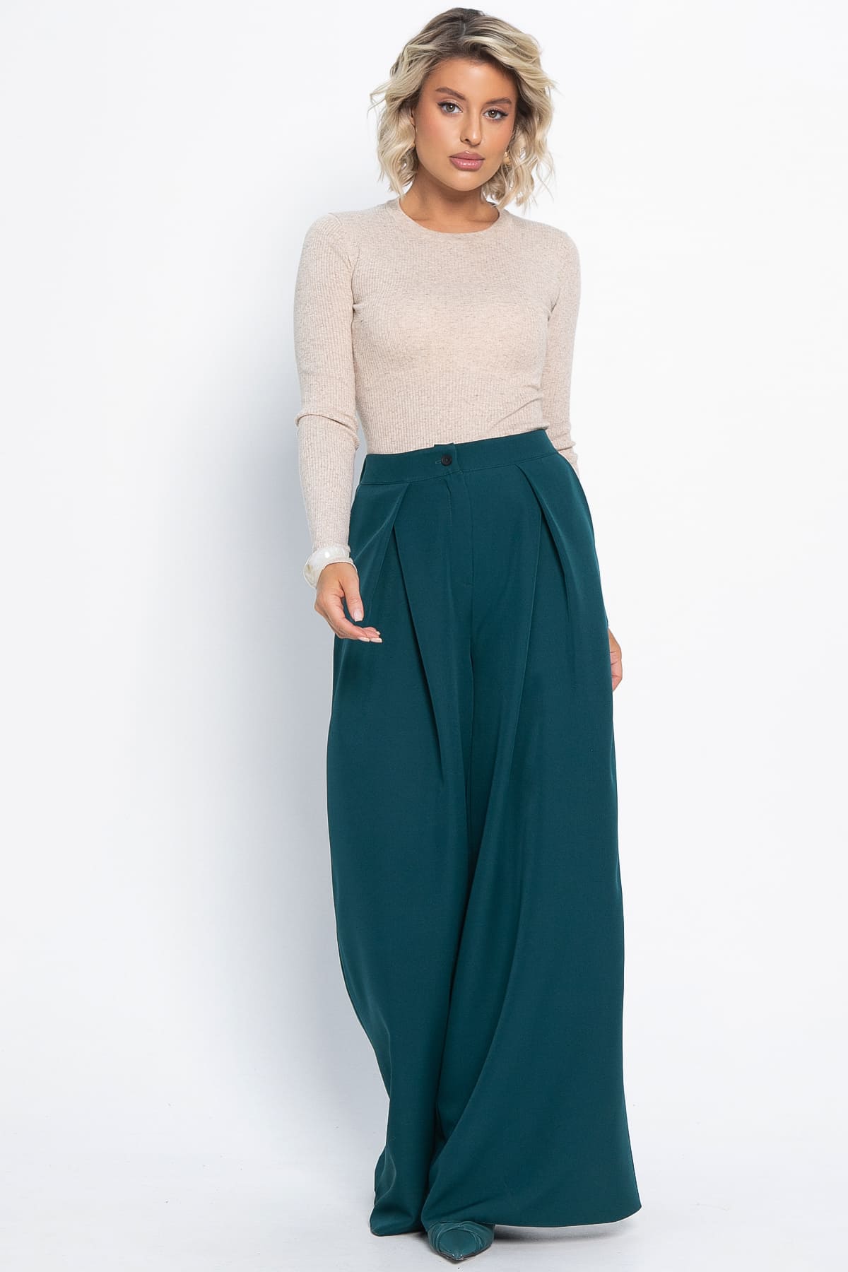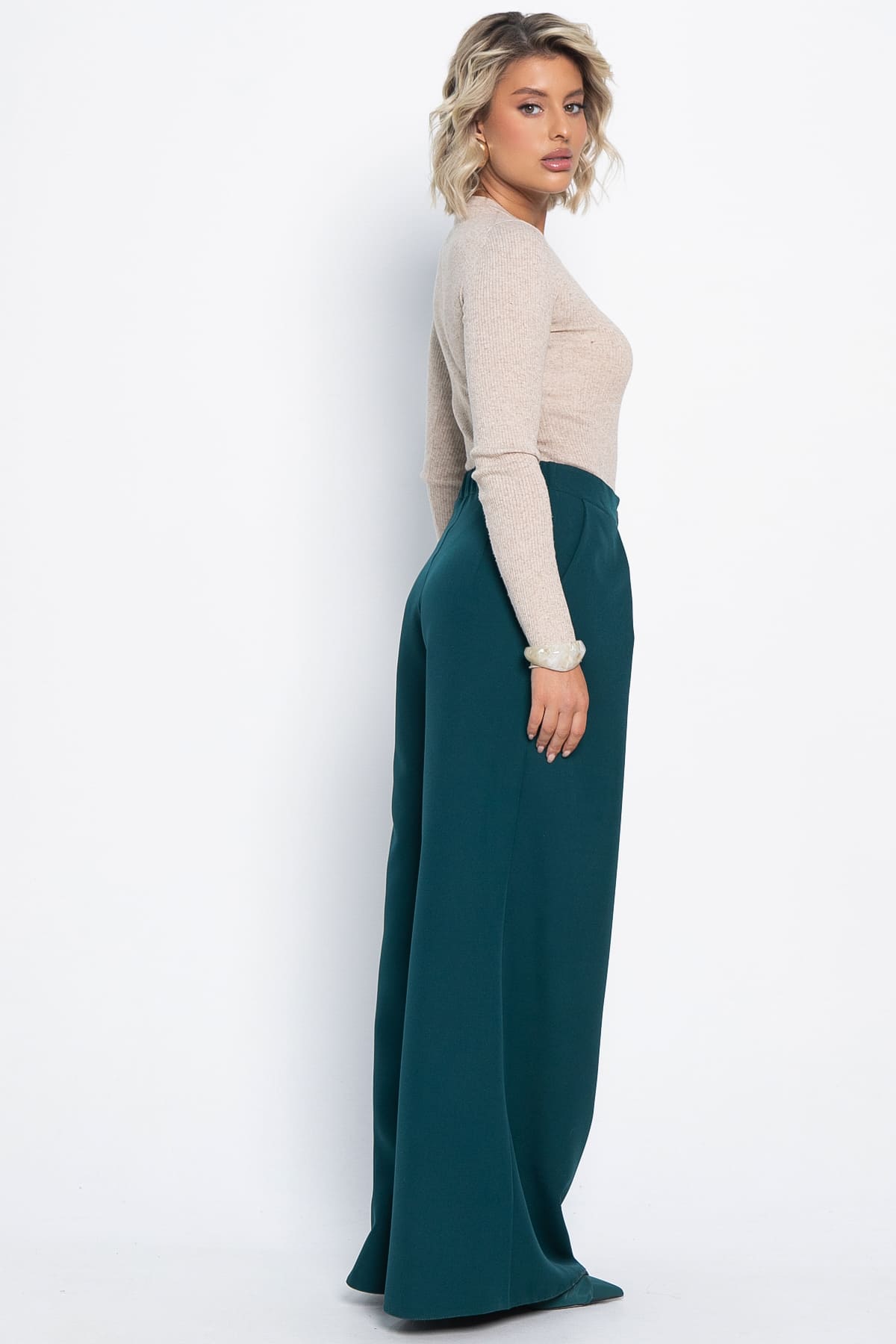 Классические широкие брюки-палаццо в красивом изумрудном цвете — идеальный выбор для модниц, ценящих комфорт и элегантность. Эти брюки идеально подходят как для повседневной носки, так и для особых мероприятий, что делает их универсальным элементом гардероба. Спинка на резинке для удобной и комфортной посадки, а спереди встречные складки придают им стильный вид. Свободный фасон брюк гармонично сочетается с различными верхами, позволяя создавать разнообразные образы — от casual до более формальных. Добавьте эти брюки-палаццо в свой гардероб и наслаждайтесь стильными и комфортными нарядами!