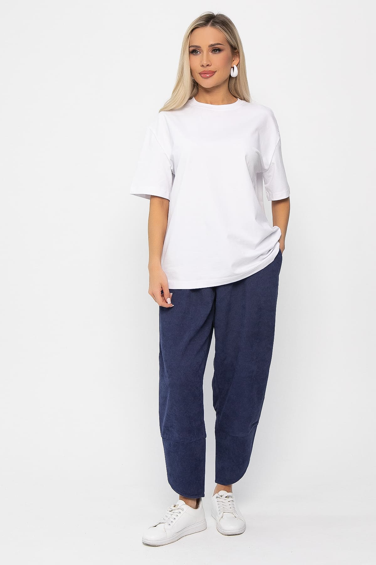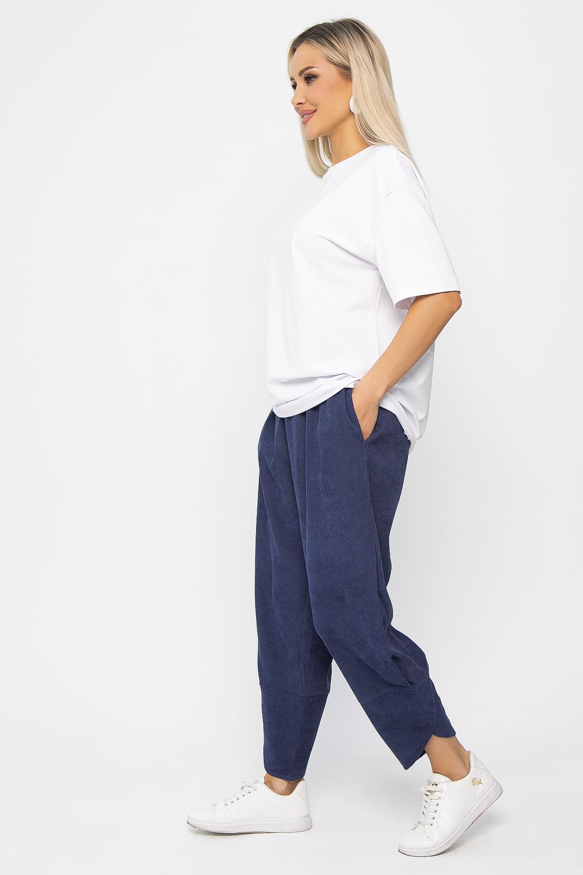 Объемные брюки в стиле бохо - это свободный непринужденный стиль современной моды. Шароварный силуэт создается за счет резинки по талии, свободной посадки в бедрах, бокового защипа по низу и оригинального высокого манжета в виде тюльпана. Свободные, прямые, просторные брюки бананы выгодно подчеркивают женские формы и скрывают недостатки. Комбинируйте их с различными видами топов, джемперов, блузок или футболок. Брюки выполнены из комфортной в носке ткани, которая не вытягивается и не деформируется после стирки.