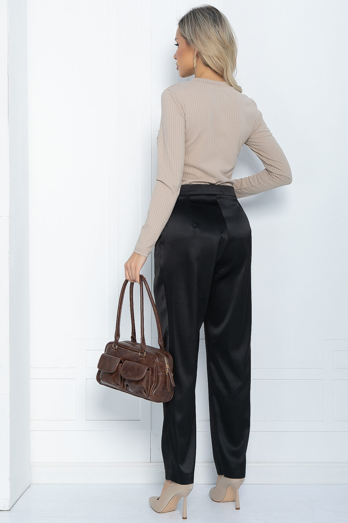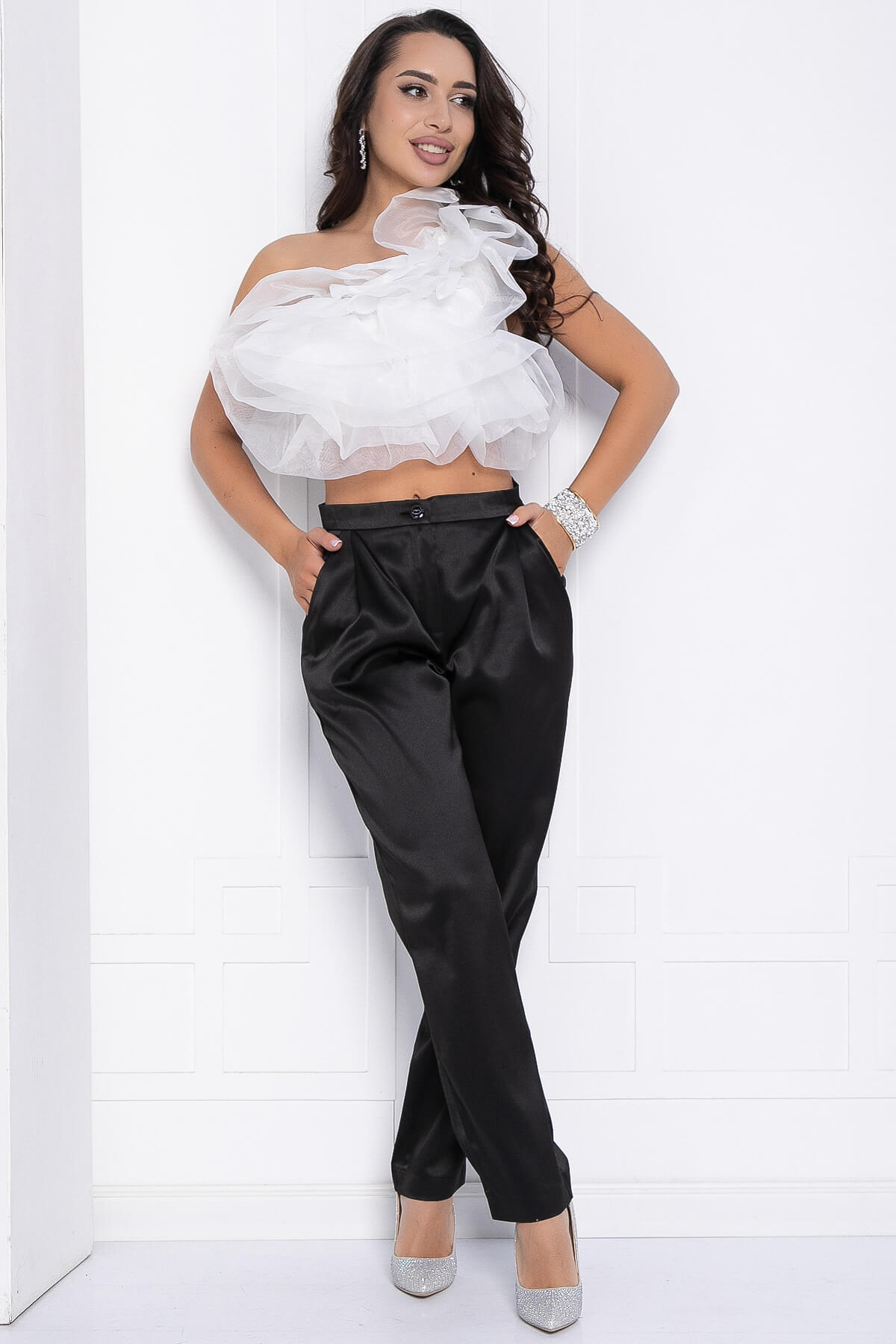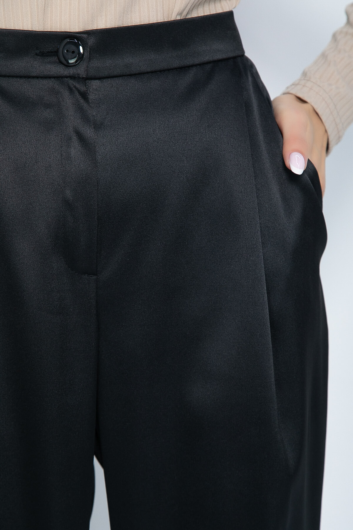 Великолепные брюки глубокого черного цвета, благодаря атласному блеску ткани, выглядят празднично и нарядно. Они станут прекрасным дополнением как к деловому образу, так и для повседневной носки. Брюки заужены к низу, а по бокам снизу предусмотрены небольшие разрезы, что делает их еще более эффектными.