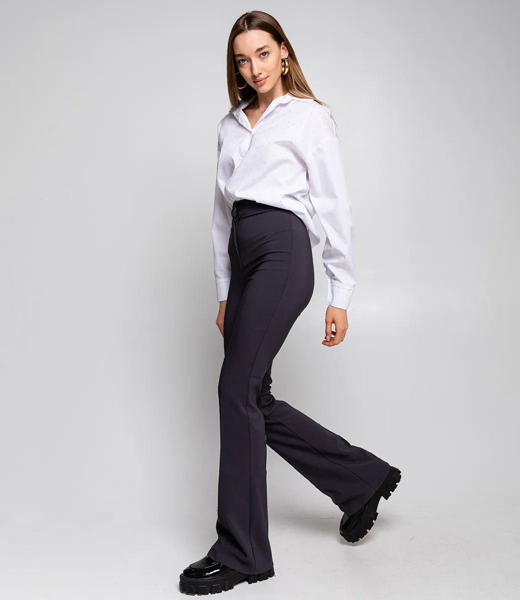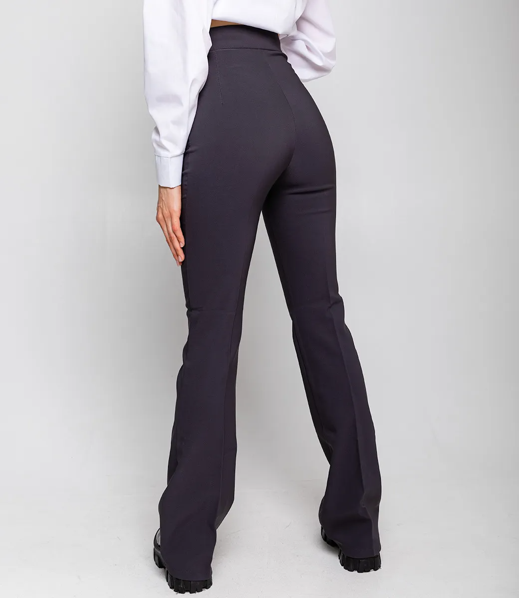 Классические брюки имеют облегающую посадку сверху и расширение (клеш) книзу. Брюки облегают талию и бедра, выглядят приталенными и акцентируют фигуру. Они имеют мягкую, плавную линию, которая опускается от талии и постепенно расширяется по всей длине ног. Крой обеспечивает свободу движения в области бедер и ног, сохраняя элегантный вид. Клеш брюк начинается примерно от середины бедра и расширяется внизу ноги, формируя полусферическую форму. Это создает видимость длинных, стройных ног и придает образу роскошный и женственный вид. Классические брюки сочетаются со множеством верхней одежды, такой как блузки, рубашки и блейзеры. Они идеально подходят для офисного стиля, деловых встреч и других формальных или полуформальных мероприятий.