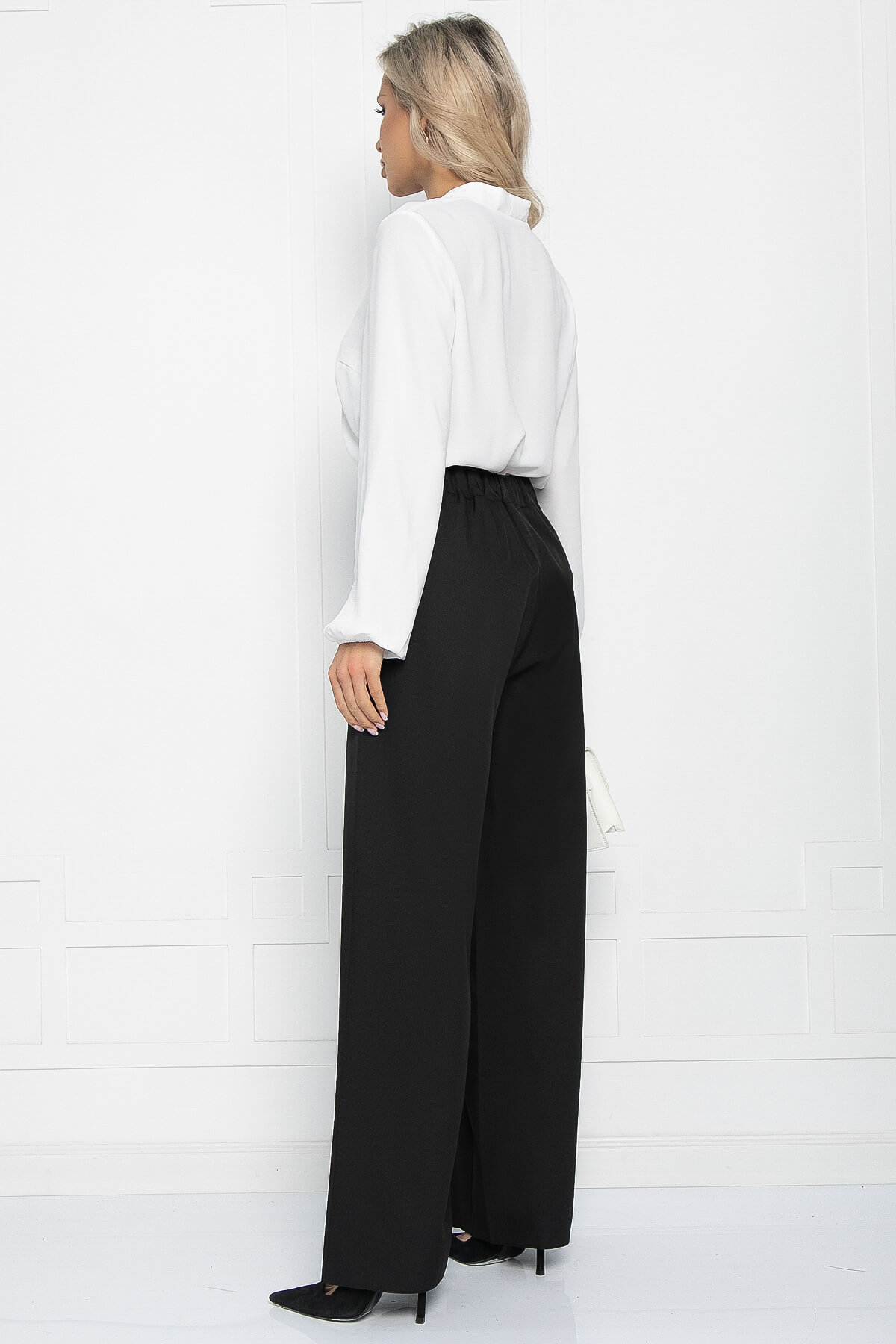 Роскошные брюки палаццо прекрасно подойдут для стильного делового образа. Классический чёрный цвет позволяет комбинировать их с разнообразным по цвету верхом. Такие брюки отлично подходят на любой случай - на учебу, работу и даже на торжественное мероприятие! Карманы есть в боковых швах. По талии притачной пояс, по спинке резинка.