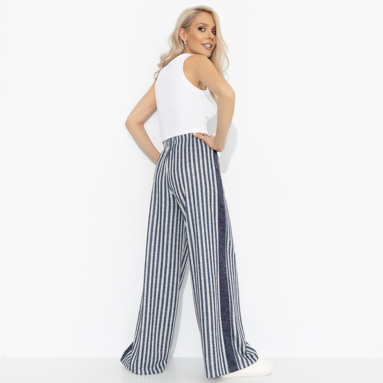Впереди только светлые полосы! Эти брюки ЧАРУТТИ – как визуальное напоминание: даже самый расслабленный день может стать началом полосы любви и успеха. Пока одни ждут удачу, вы просто её носите. Трикотажные брюки свободного кроя в вертикальную светло-синюю и серую полоску. Эластичный пояс обеспечивает отличную посадку. Трикотаж приятен на ощупь, не сковывает движений.