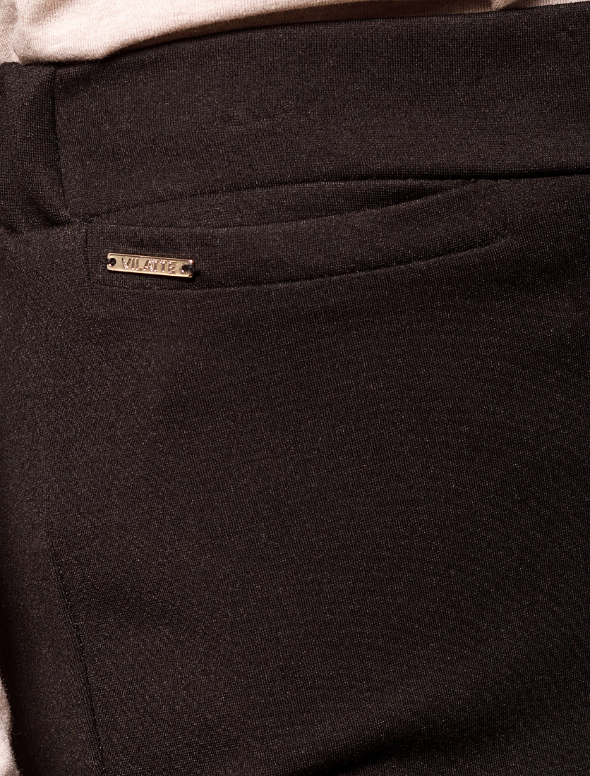 Брюки - дудочки выполнены из плотного джерси. Высокая посадка и стрелки зрительно увеличивают рост и визуально стройнят. Модель дополнена сзади эластичным поясом на резинке и боковыми разрезами по низу штанин. Лаконичные брюки станут идеальным дополнением базового гардероба. С легкостью дополнят строгий офисный стиль и повседневный аутфит.