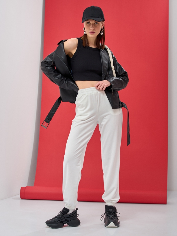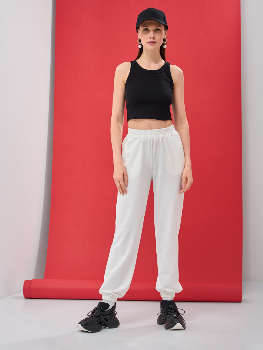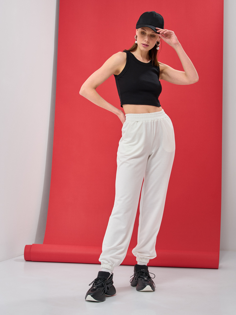 Оригинальные брюки-джоггеры однотонные. Свободный крой в области бедер поможет скрыть недостатки фигуры. Ткань –фур 2-х нитка, в молочном приятном цвете, мягкая и очень приятная к телу, подарит невероятный комфорт и уют, что так не заменимо для повседневного гардероба. Изделие на резинке по линии талии и низу брючин. Карманы в боковых швах. Рост модели 170 см. Изделие на модели 40-42р-ра. Длина изделия 106.1 см. Машинная стирка при 30 гр.С 92% хлопок, 8% эластан