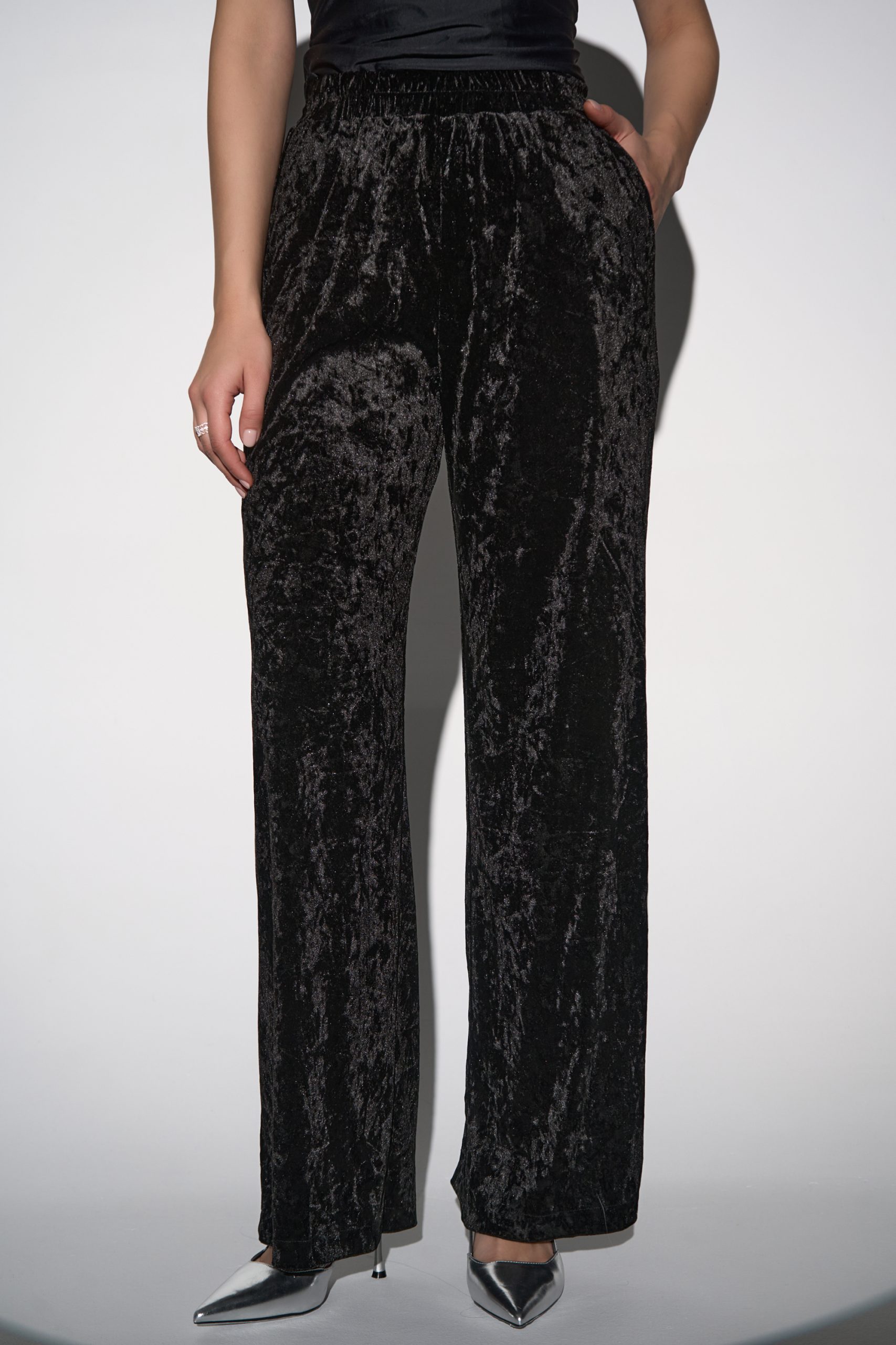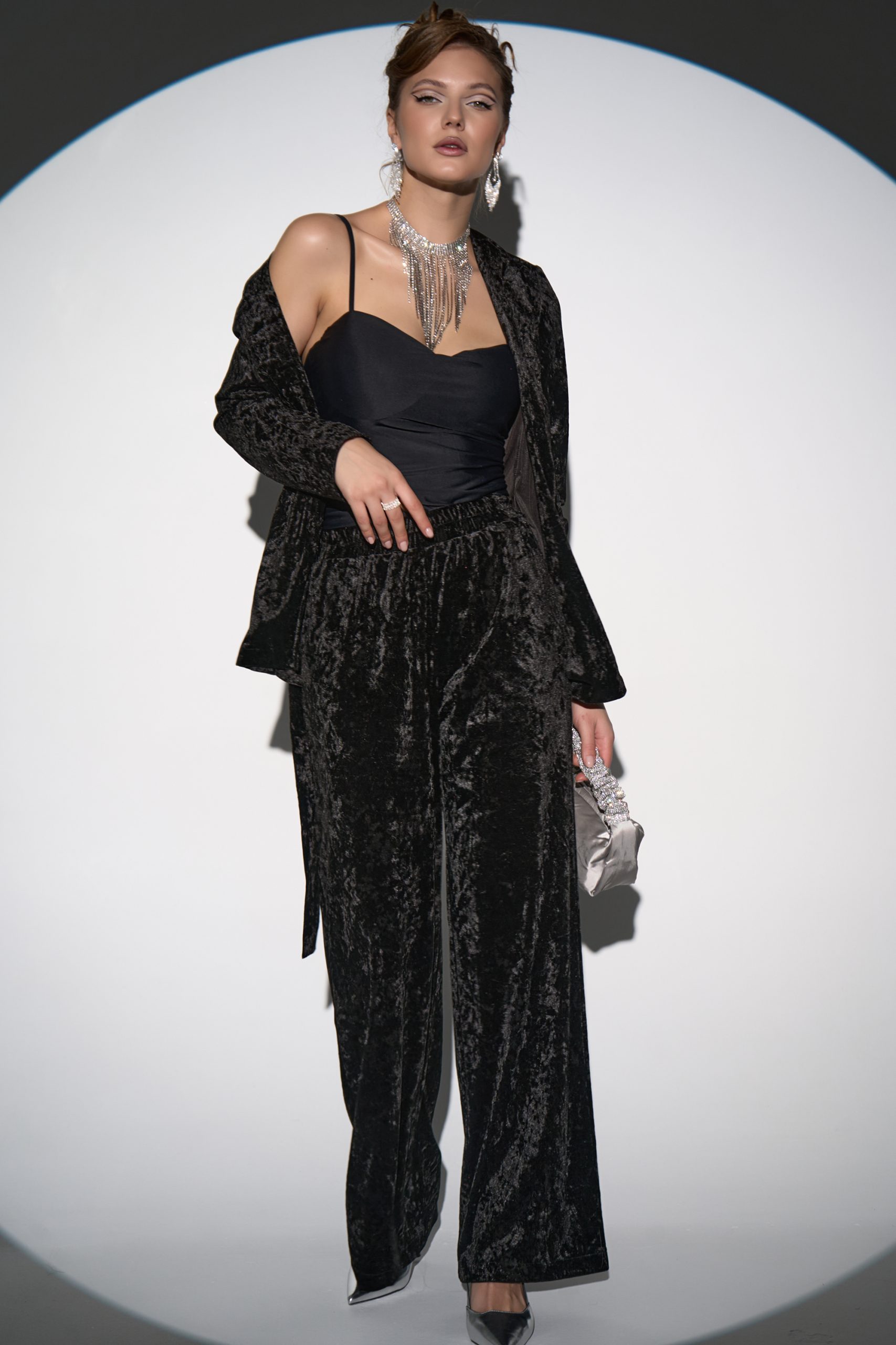 Комфортные брюки на резинке идеально дополняют верх, обеспечивая свободу движений. Свободный крой и лёгкая драпировка бархата создают элегантный, непринуждённый силуэт. Брюки легко комбинируются с обувью на каблуке или балетками, делая образ завершённым и гармоничным