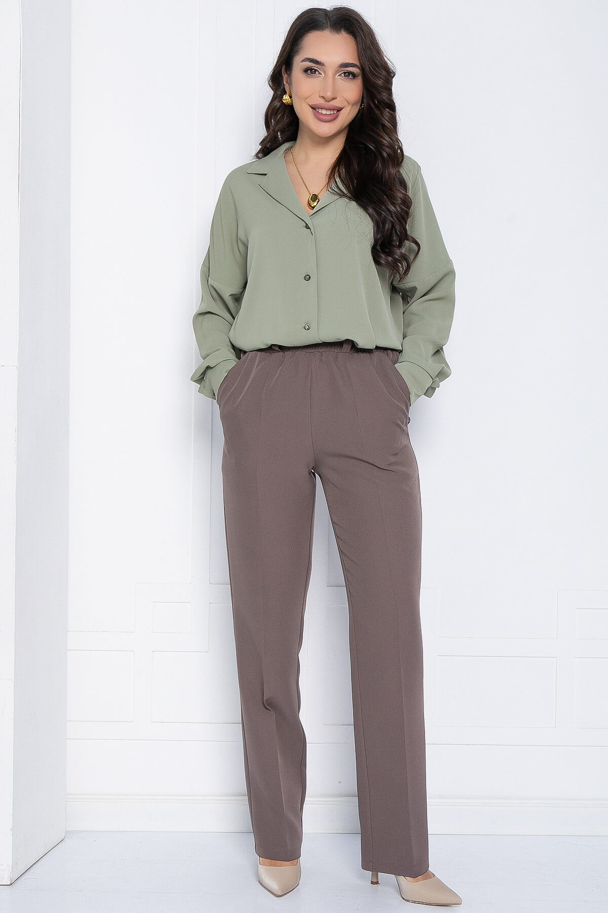 Классические брюки станут отличным дополнением к вашему гардеробу. Они изготовлены из ткани, которая не мнётся, что позволяет им сохранять безупречный вид в течение всего дня. Благодаря высокой посадке и резинке на талии эти брюки обеспечивают максимальный комфорт. Они подходят как для офисного стиля, так и для более расслабленных образов. Можно носить как с жакетом, так и со свитером, создавая стильный и современный образ.