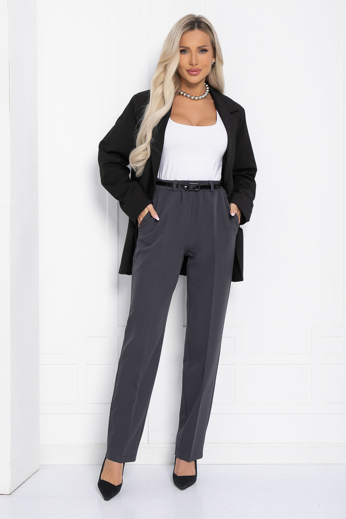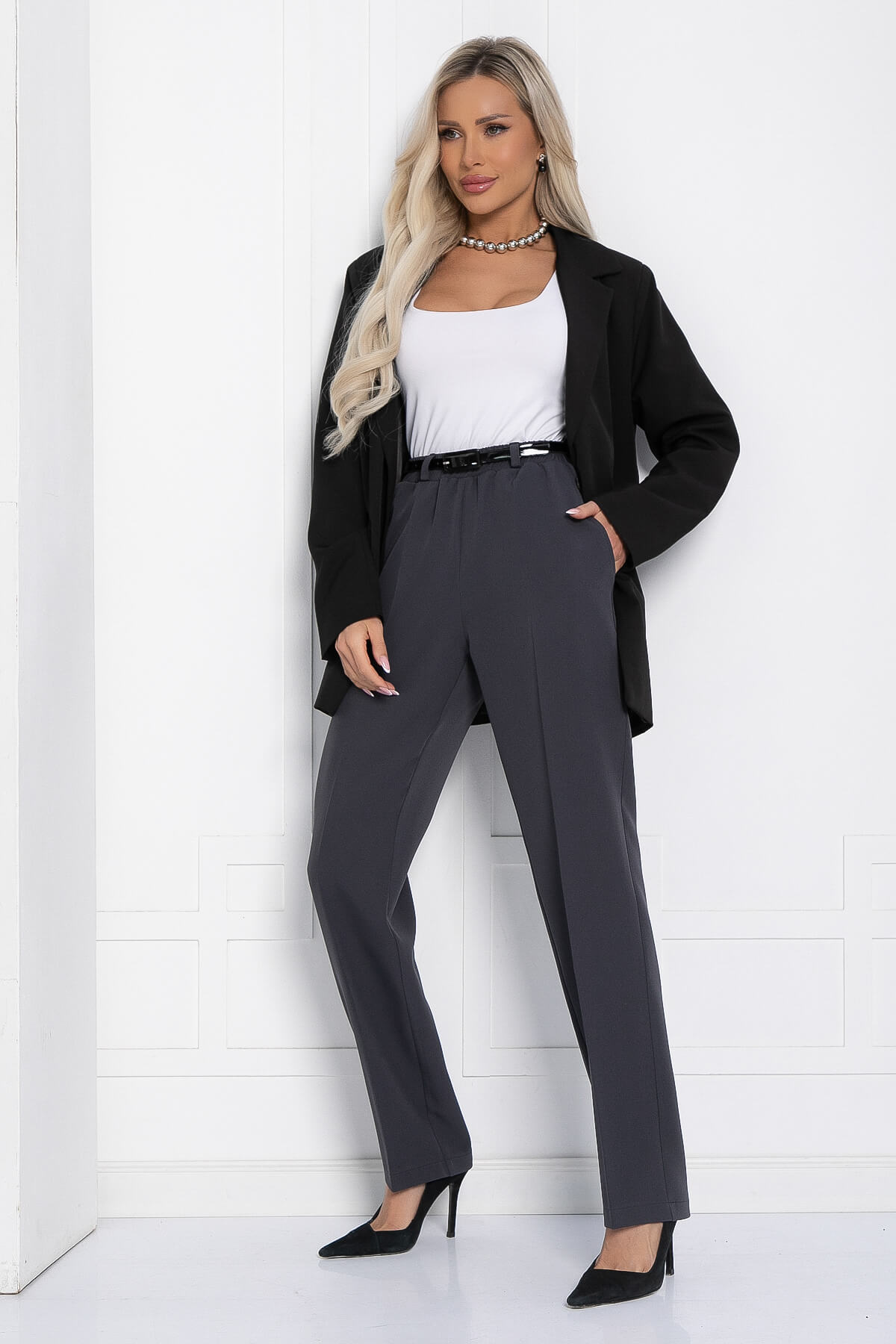 Классические брюки станут отличным дополнением к вашему гардеробу. Они изготовлены из ткани, которая не мнётся, что позволяет им сохранять безупречный вид в течение всего дня. Благодаря высокой посадке и резинке на талии эти брюки обеспечивают максимальный комфорт. Они подходят как для офисного стиля, так и для более расслабленных образов.