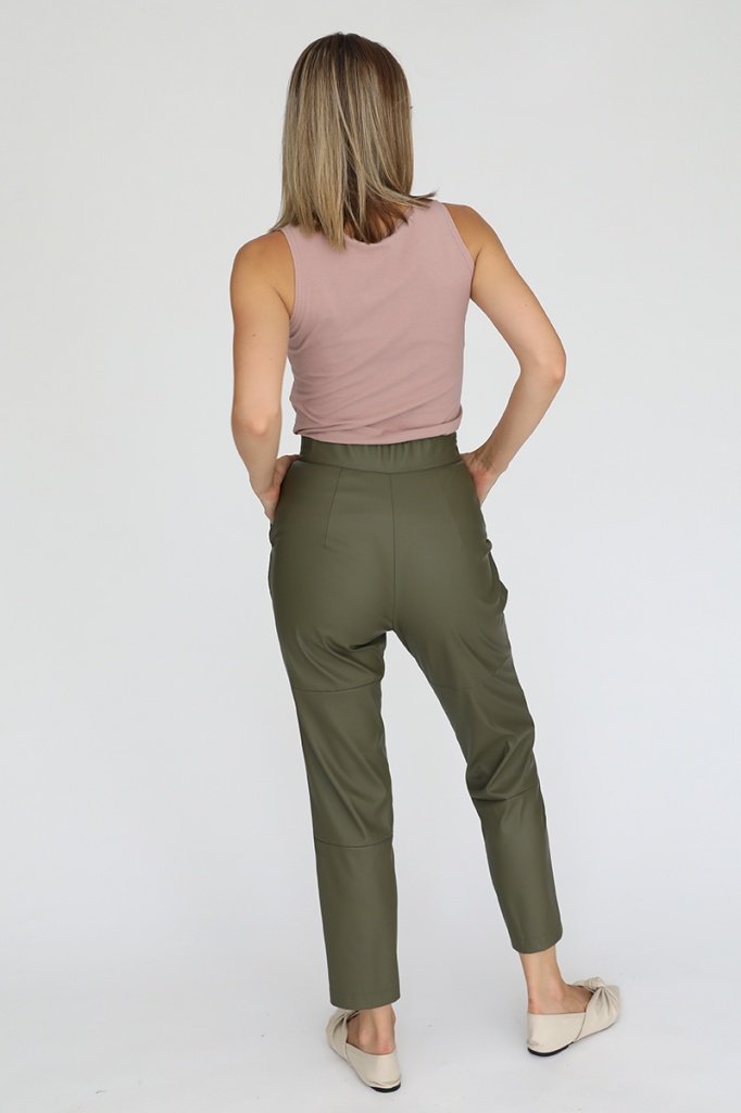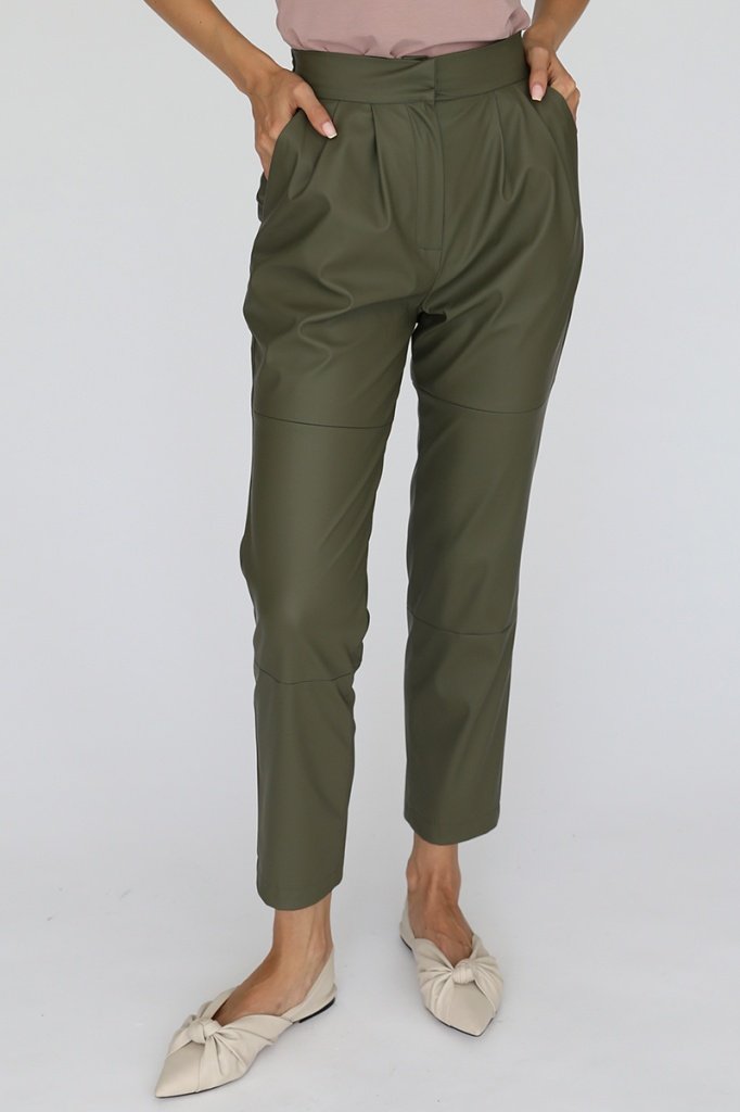 Брюки с высокой посадкой и защипами по переду, застегиваются на молнию и 2 крючка. Резинка на поясе со стороны спинки, карманы в боковых швах.