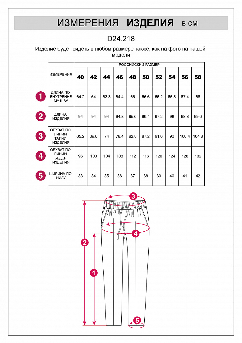 Брюки выполнены из плотного лиоцела. Добавление синтетических волокон в составе изделия предотвращает сминаемость. Эластичный пояс на резинке с регулируемым шнуром комфортно фиксирует изделие не сковывая движений. Модель дополнена боковыми карманами и металлическим логотипом бренда. Для создания завершенного образа сочетайте в костюме с топом D23.058, блузкой D28.054, D29.238, D29.239 и D29.240