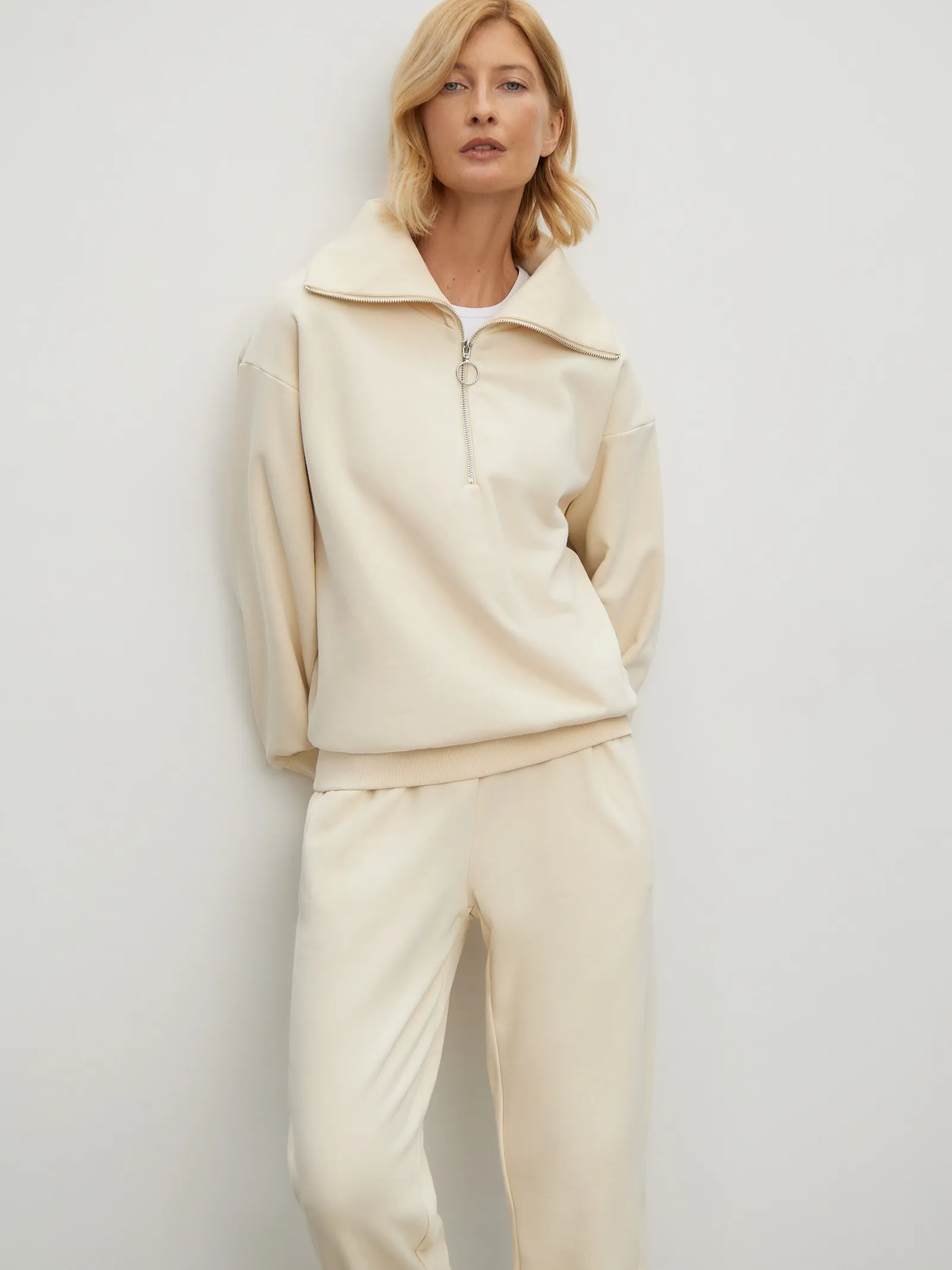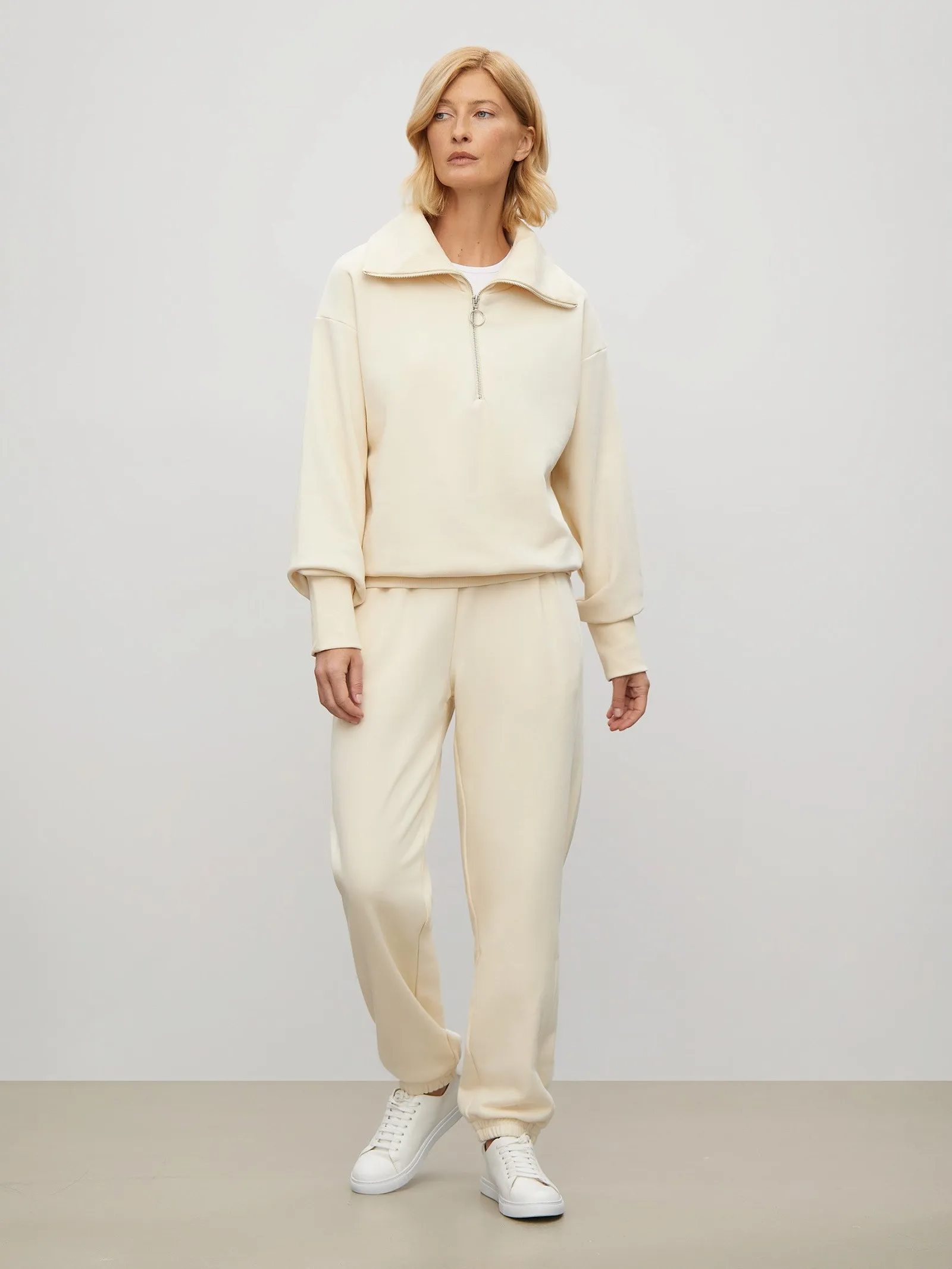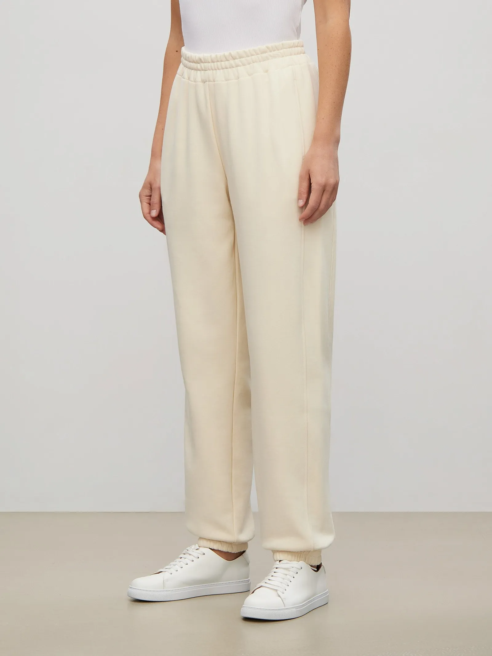 Брюки молочного цвета из мягкого материала с высоким содержанием хлопка. Респектабельный цвет сочетается с непринуждённым фасоном. Зауженная модель высокой посадки выполнена на комфортной широкой резинке и дополнена широкой резинкой по низу брючин. Завершить образ можно свитшотом из комплекта.