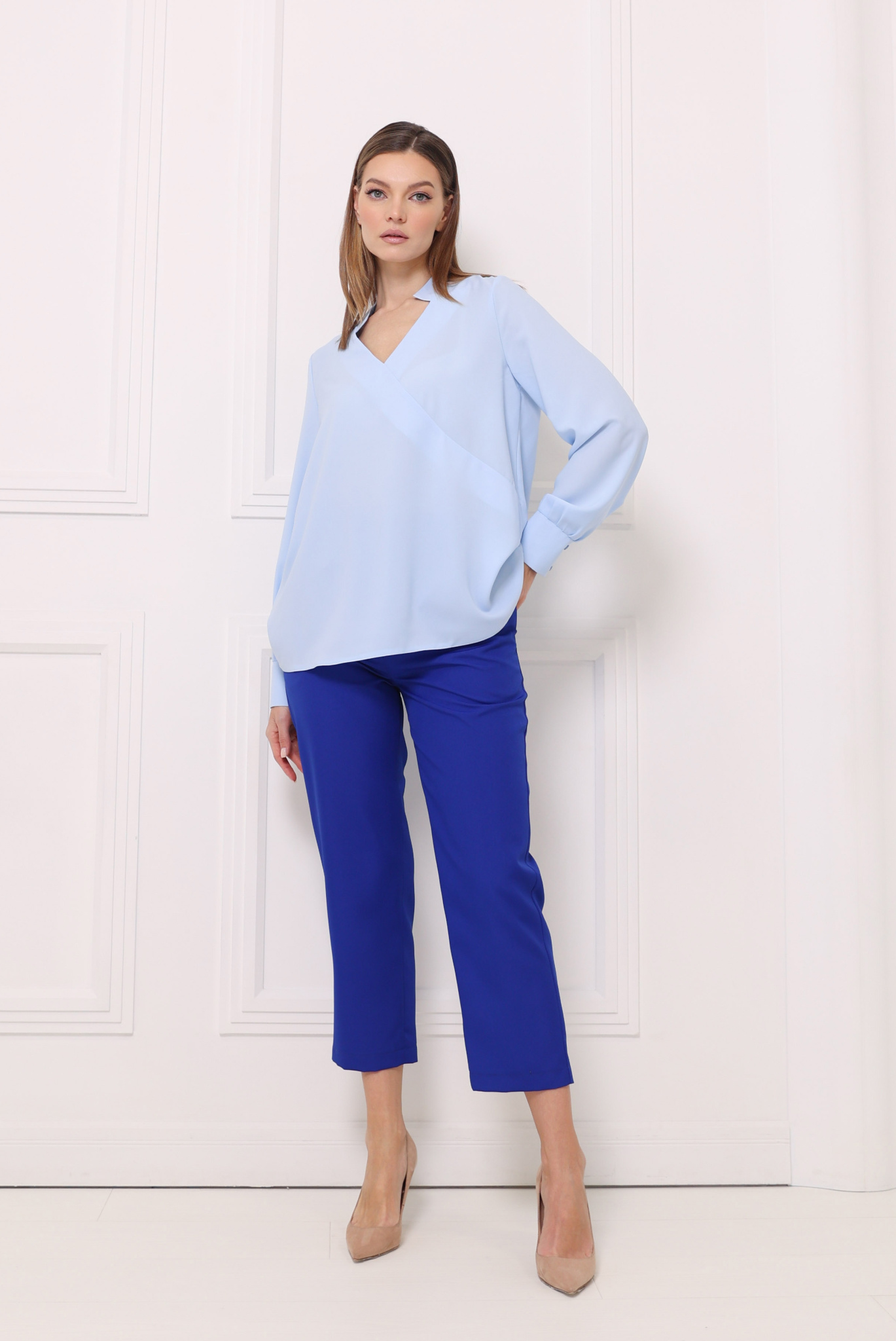 Брюки- капри прямого кроя. Приточной пояс с резинкой со стороны спинки. Карманы в боковых швах. Застежка на молнию и пуговицу.