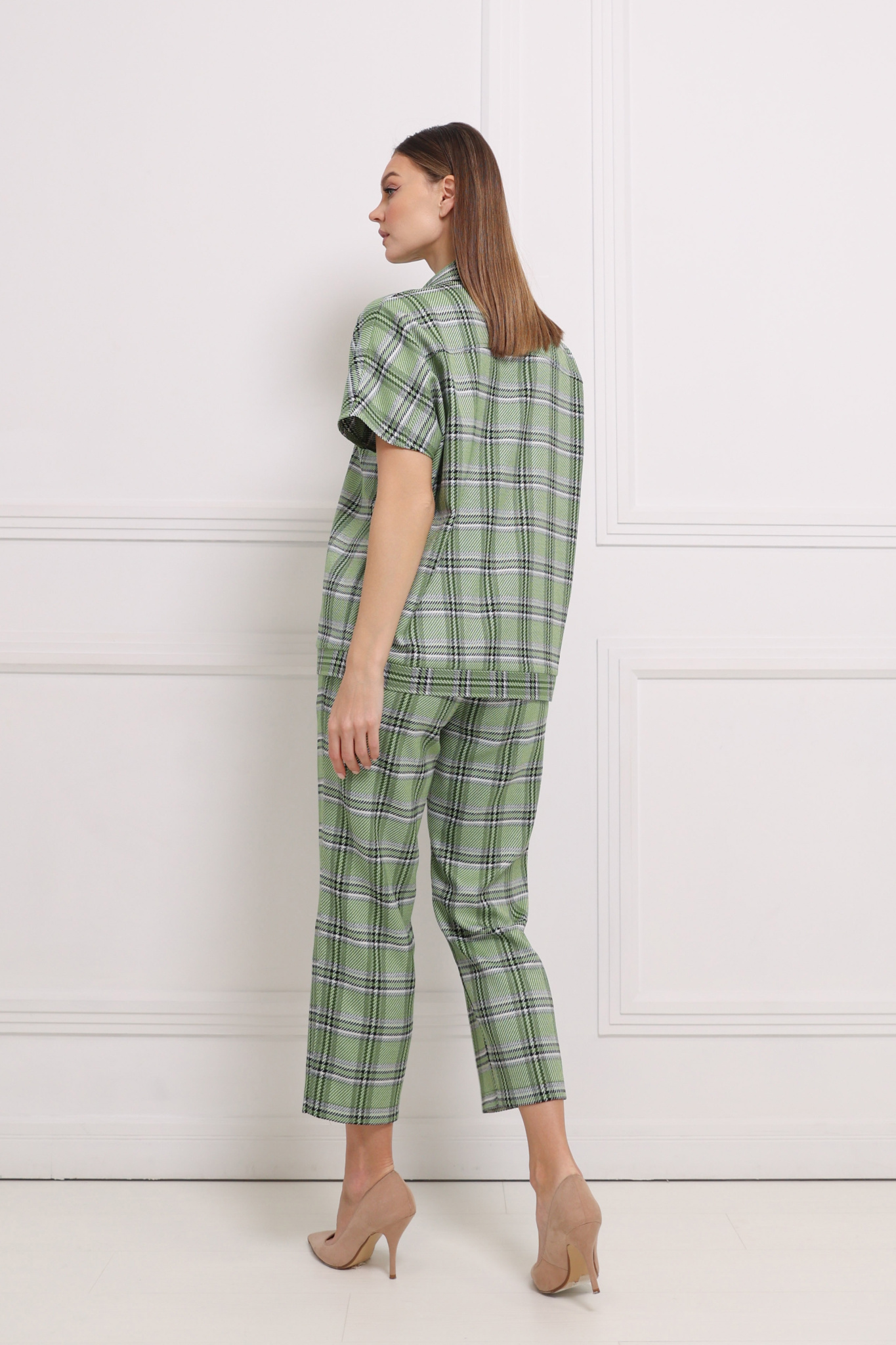Брюки- капри прямого кроя. Приточной пояс с резинкой со стороны спинки. Карманы в боковых швах. Застежка на молнию и пуговицу.