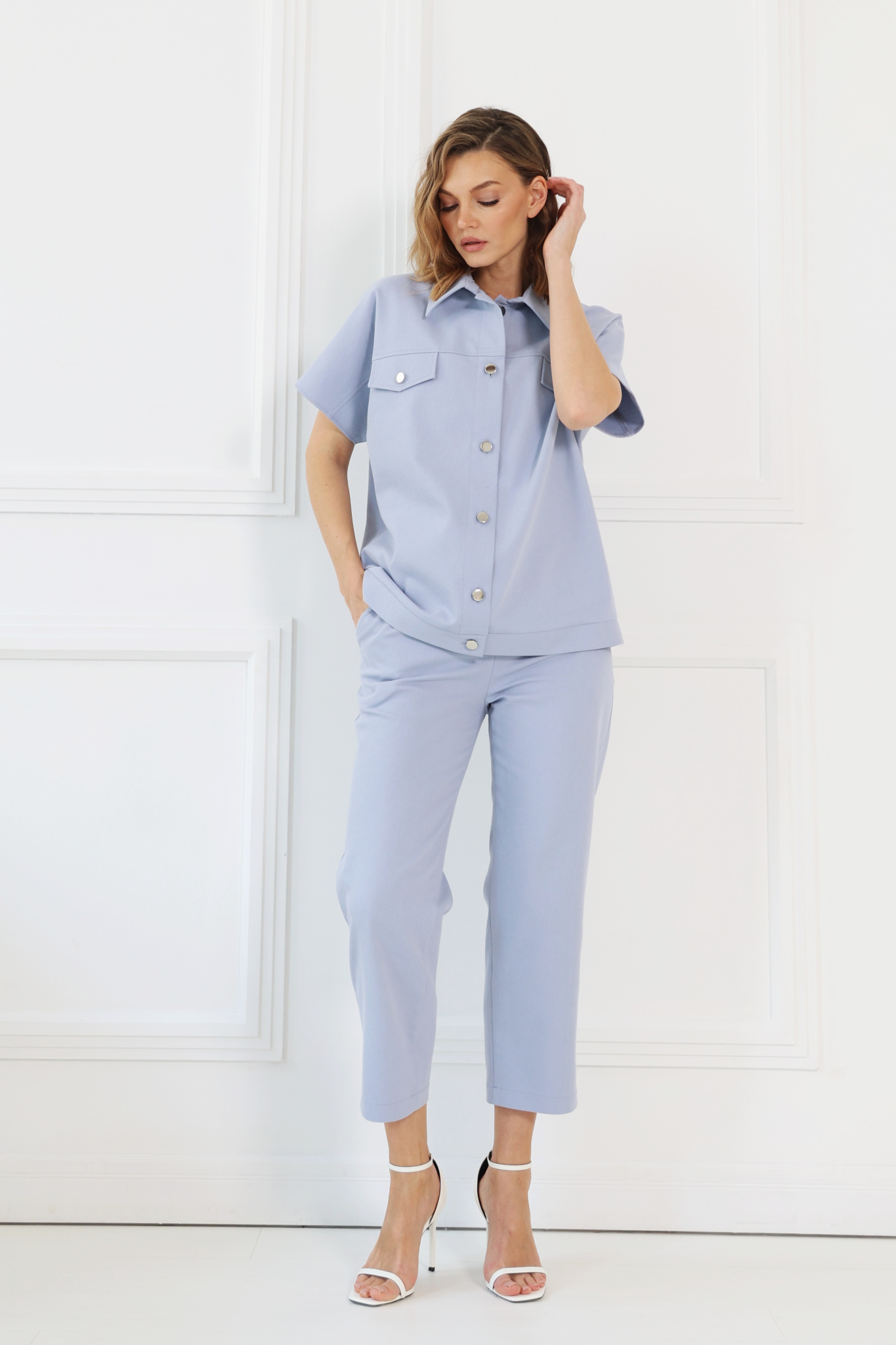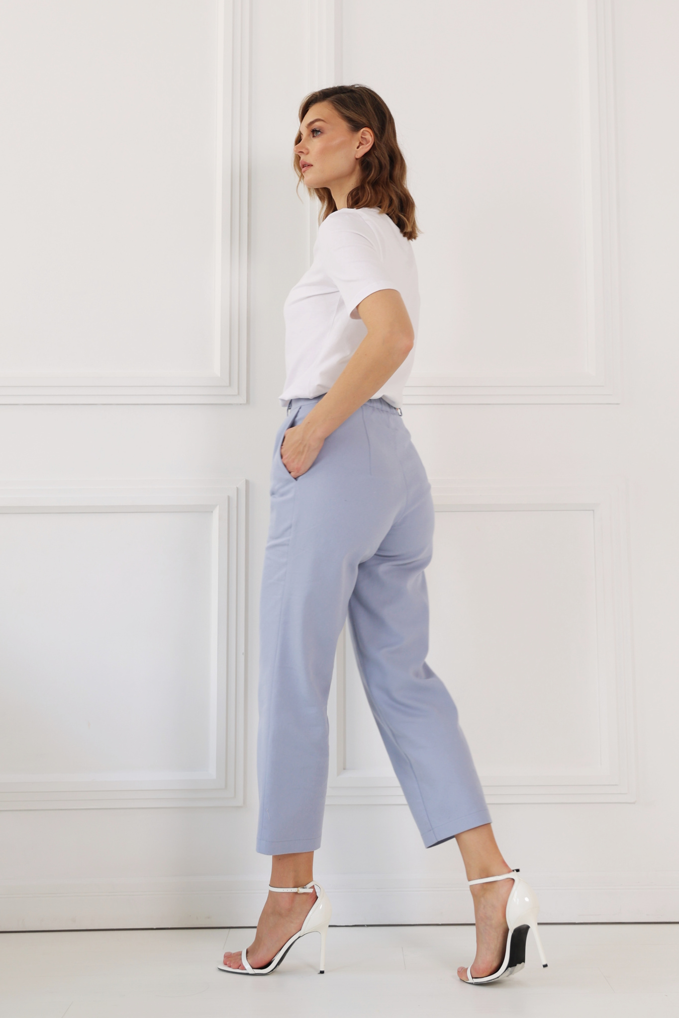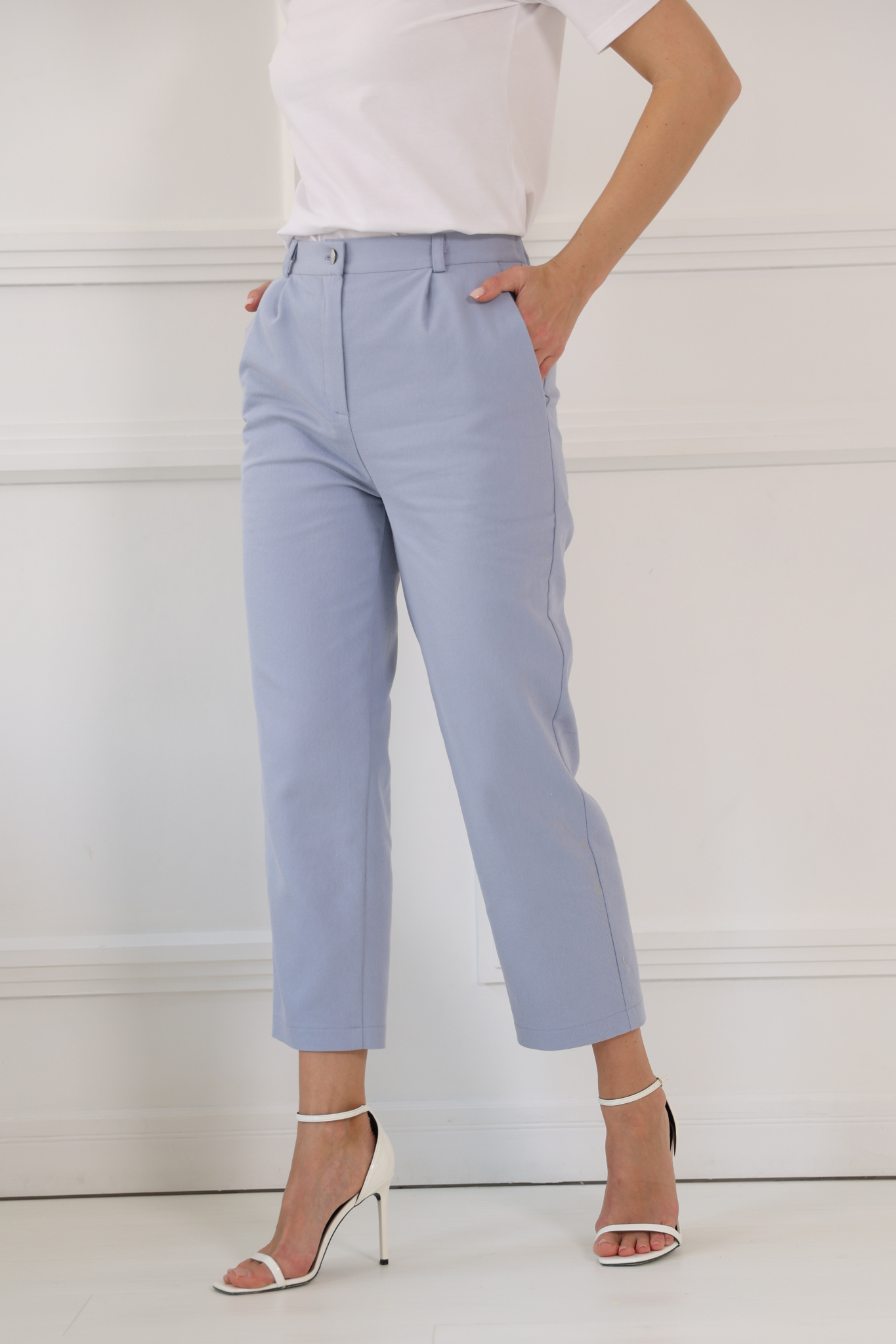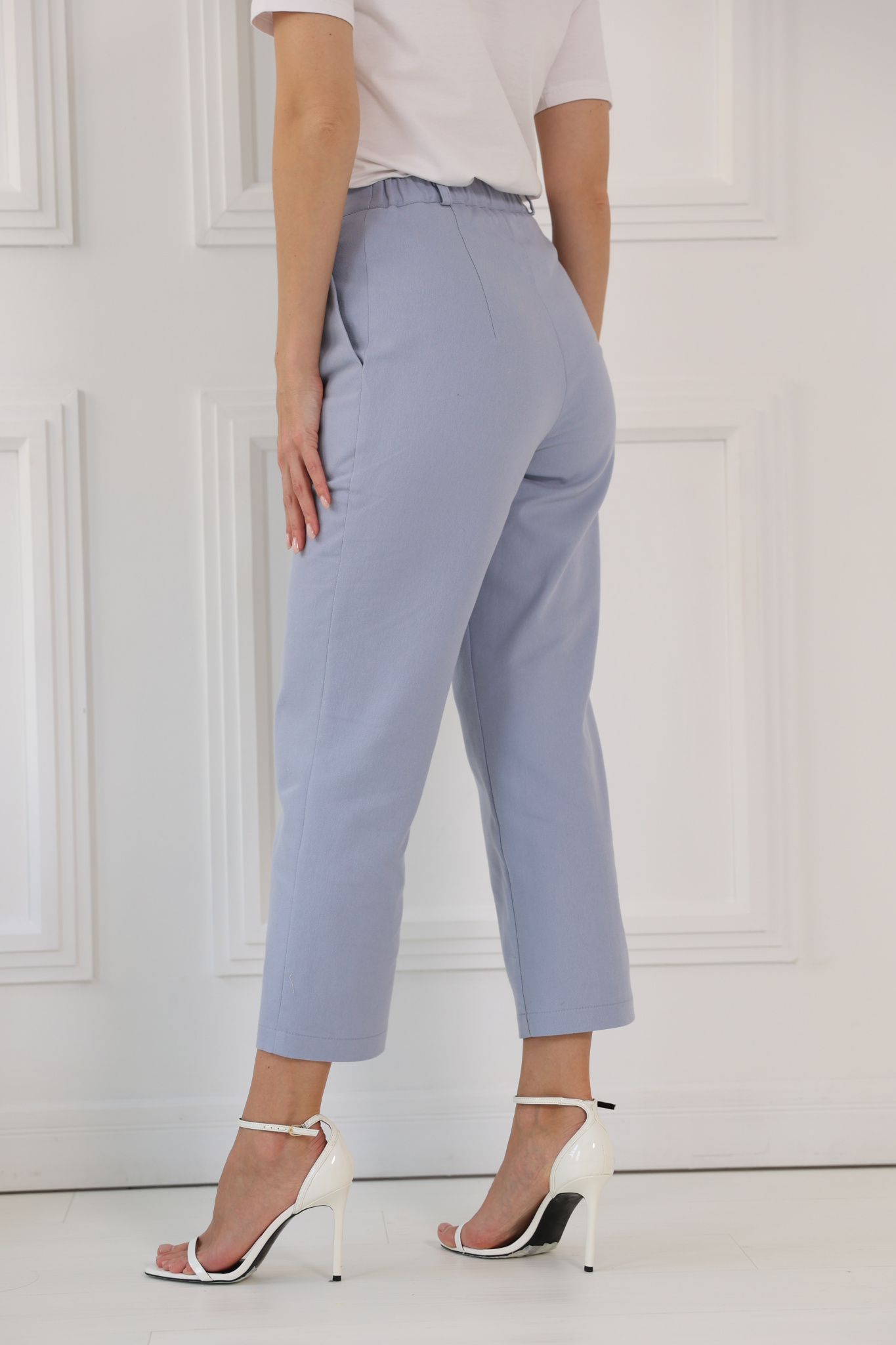 Брюки- капри прямого кроя. Приточной пояс с резинкой со стороны спинки. Карманы в боковых швах. Застежка на молнию и пуговицу.