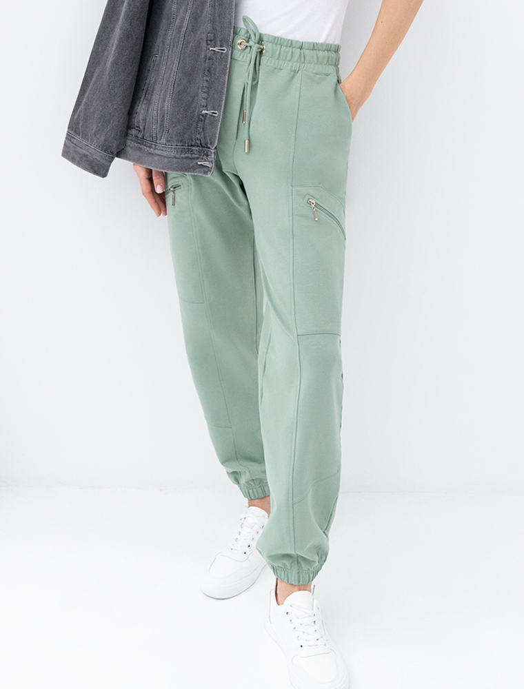 Трендовые брюки "карго" выполнены их эластичного футера двухнитки. Модель дополнена двумя классическими боковыми карманами и глубокими карманами на молнии. Удобный пояс на резинке регулируется хлопковым шнурком и обеспечивает удобную посадку на талии. Изделие украшено фирменным логотипом бренда. Сочетайте в костюме с джемпером D49.944, D49.946 и худи D49.949