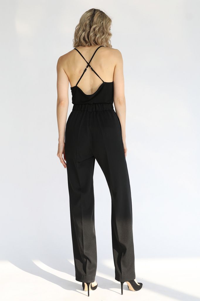 Брюки прямые из костюмной ткани, притачной пояс с резинкой со стороны спинки и шлевками, две зафиксированные складки по переду от пояса, переходящие в заутюженные стрелки,  боковые карманы в швах.