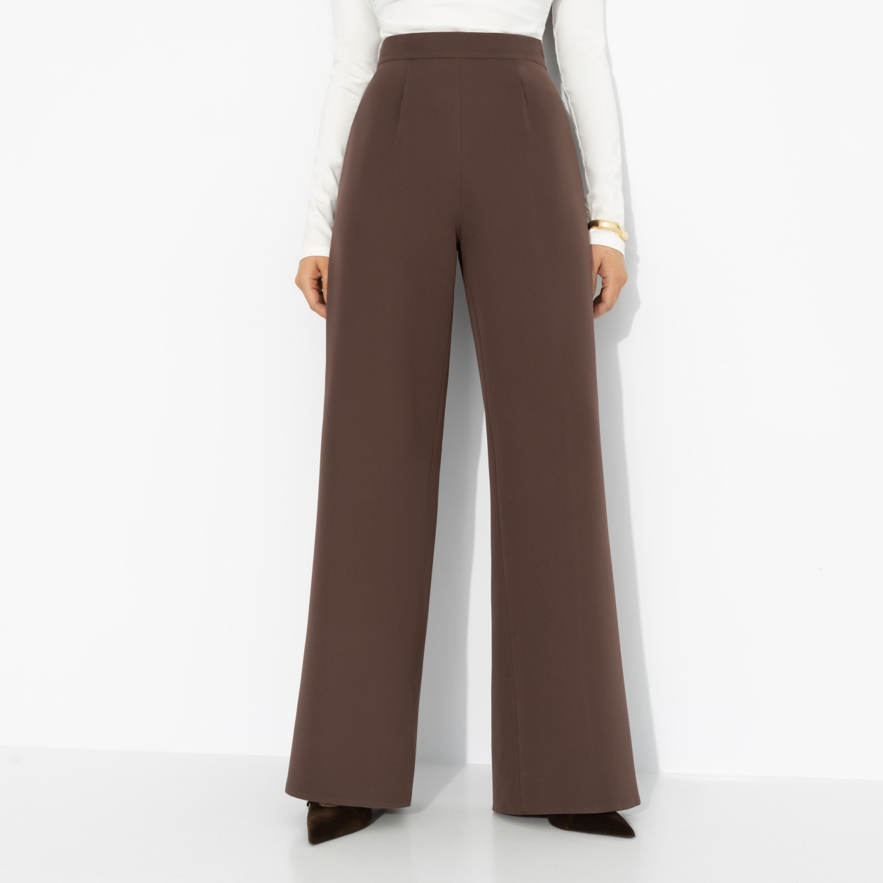Нам было сегодня лет, когда мы узнали, что коричневый может быть универсальнее чёрного. Стилист ЧАРУТТИ рассказали нам, что шоколадный оттенок работает мягче, теплее и неожиданно подходит ко всему – от молочного до ярких акцентов. Брюки «Модный экстаз» вытягивают силуэт, красиво садятся по талии и комфортно двигаются вместе с тобой. Костюмная ткань «барби» держит форму и характер. Вывод простой: чёрный всё ещё классика, но шоколад – это уже вкус. Брюки без карманов, застёжка сбоку на скрытую молнию.