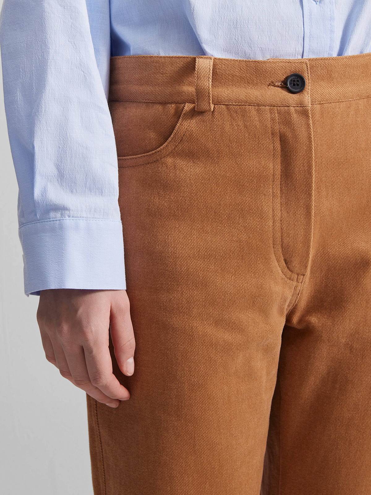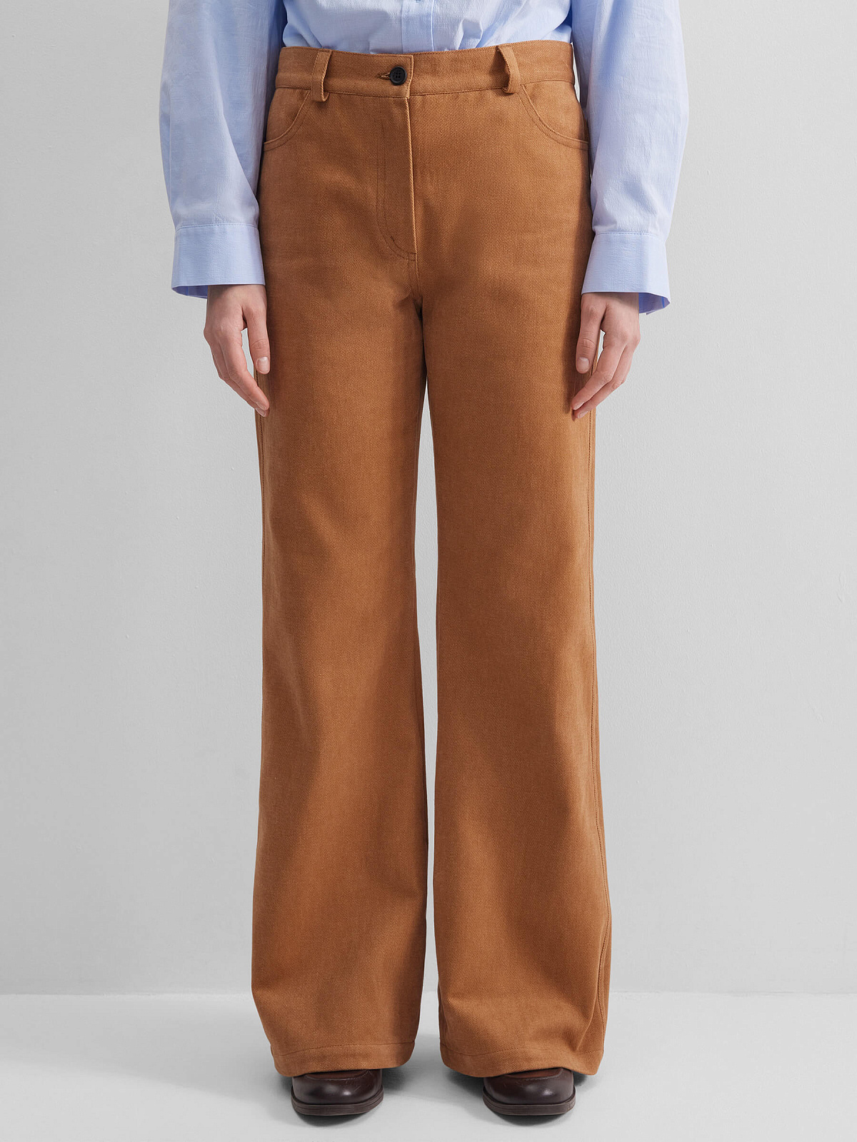 Брюки широкого кроя с силуэтом клеш — идеальное решение для тех, кто ценит комфорт и свободу движений. Изготовленные из 100% хлопкового денима, они не имеют подклада, что делает их легкими и удобными для носки в любое время года. Застежка на молнию и пуговицу обеспечивает надежную фиксацию, а два боковых и два задних кармана добавляют практичности и функциональности.