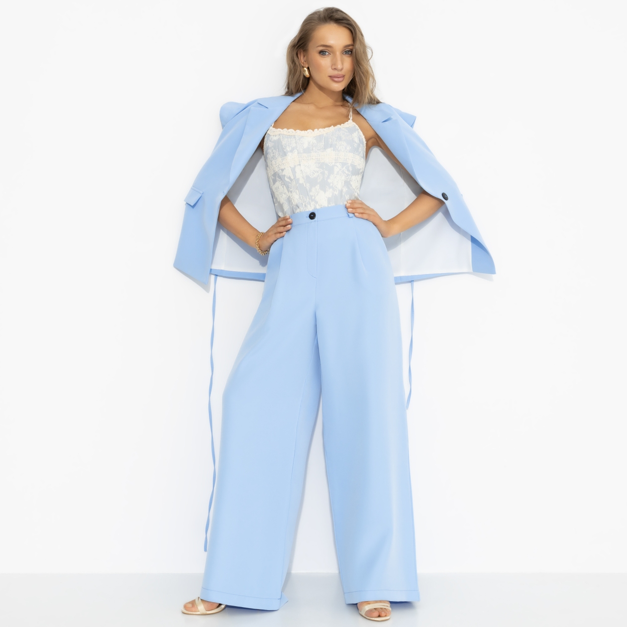 Весна пришла – и ты решила выйти в свет вместе с ней. Эти голубые брюки собирают образ так легко, будто знают прогноз лучше синоптиков. Высокая посадка подчёркивает талию, широкий крой вытягивает силуэт и эффектно струится при каждом шаге. Ткань держит форму, но не сдерживает ни одного твоего стремления. Изделие с карманами.
