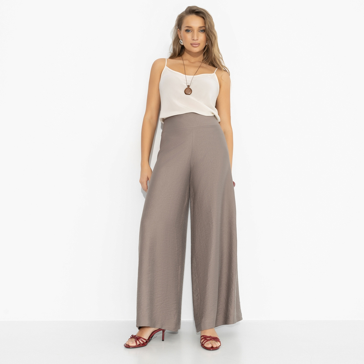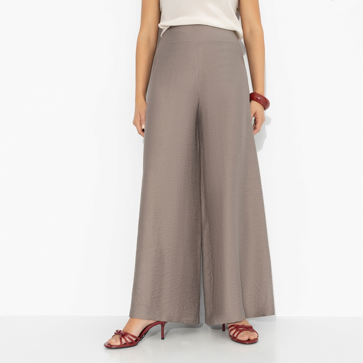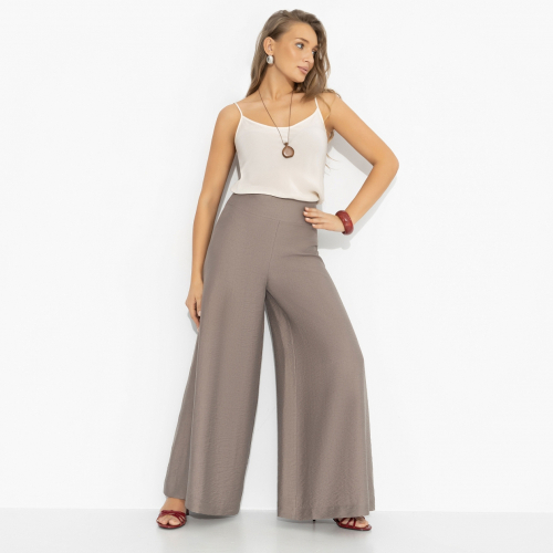 В этих брюках хочется идти медленно – просто, чтобы дольше наслаждаться красотой. Широкий силуэт струится при каждом шаге, высокая посадка собирает талию и держит осанку. Ткань мягко драпируется, создавая ощущение воздуха вокруг тела, но линия кроя остаётся чёткой и архитектурной. Расслабленность в движении, собранность в деталях – редкое сочетание, которое читается с первого взгляда.