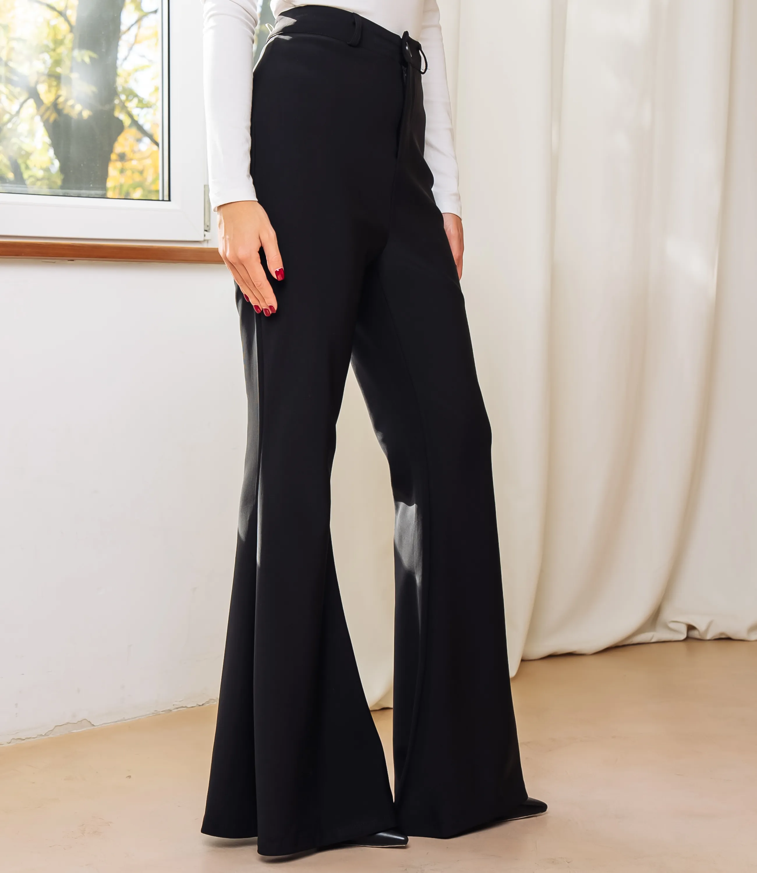 Брюки — это часть гардероба, которая подчёркивает привлекательность и уверенность каждой покупательницы.Брюки с высокой посадкой, плотно облегающие талию и бёдра и затем расширяющиеся от колена книзу, создают выраженный клёш с объёмным низом; пояс средней ширины с петлями для ремня и передней застёжкой на пуговицу и скрытую молнию; передняя часть гладкая, без защипов и лишних декоративных элементов, швы ровные по внутренней и внешней стороне ноги для удлинения силуэта. Для пошива использован 95% полиэстер и 5% эластан. Материал прочный, хорошо держит форму, стойко сохраняет цвет при частых стирках и практически не мнётся, что упрощает уход и снижает процент рекламаций. Плотная структура ткани обеспечивает аккуратный силуэт и презентабельный внешний вид даже при интенсивной эксплуатации. Для оптовых покупателей брючная модель представляет собой выгодную и оборотистую позицию: универсальный крой облегчает формирование размерного ряда, а нейтральный, но стильный дизайн легко интегрируется в разные ценовые сегменты и коллекции. Рекомендуем включать брюки в капсулы «офисный гардероб», «повседневная элегантность» и «трендовые комплекты», комбинировать с блузами, жакетами и лёгкими свитерами для увеличения среднего чека. Комплектация цветов и размеров по ключевым сочетаниям ускоряет оборачиваемость. Рост 168, 89-63-90.