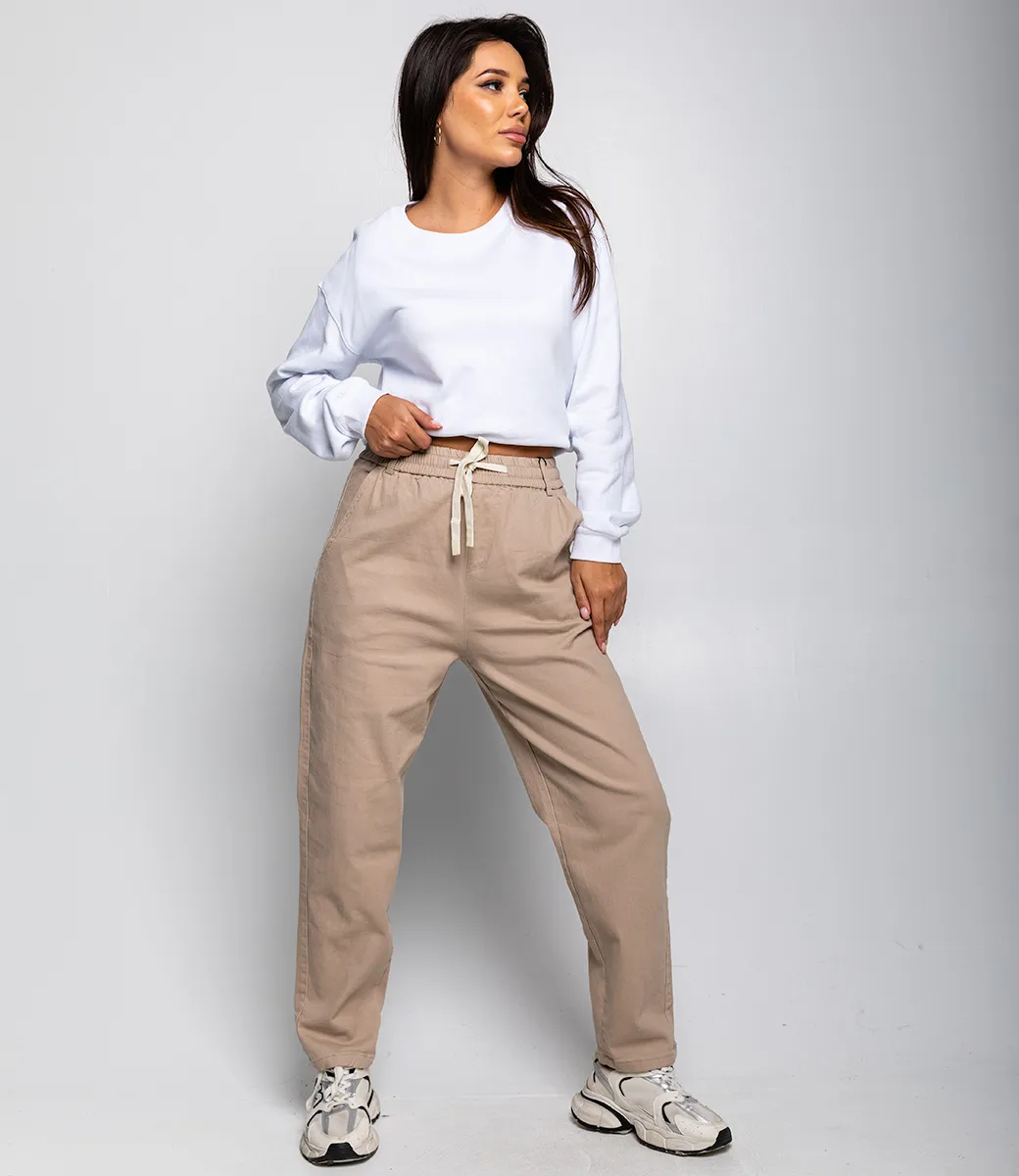 Брюки – это одежда, которая подчеркивает уникальность любой представительницы прекрасного пола. Модель брюк на резинке с карманами отлично подойдет для демисезонного сезона. Их предпочитают покупательницы, которые любят сочетание качества и цены. Фасон подчеркивает привлекательность фигуры. Компания знает, как разработать стильные и модные решения. Для изготовления использованы полиэстер 18%, хлопок 80% и 2% эластана, что характеризуется отличным качеством. Даже после многократных стирок изделие не утратит первоначальной привлекательности. Вы будете носить их с радостью. Обратите внимание на стиль брюк, который идеально впишется в ваш гардероб. Цвет и дизайн являются насыщенными и полностью соответствуют фотографии на сайте. Чтобы вы были уверены в размере, мы представили на странице таблицу. Воспользовавшись ею, вы сможете сами обмерить себя и удостовериться. Установленная нами цена является приемлемой. Не откажите себе в удовольствии быть неповторимой! Рост модели 170, 86-68-95.
