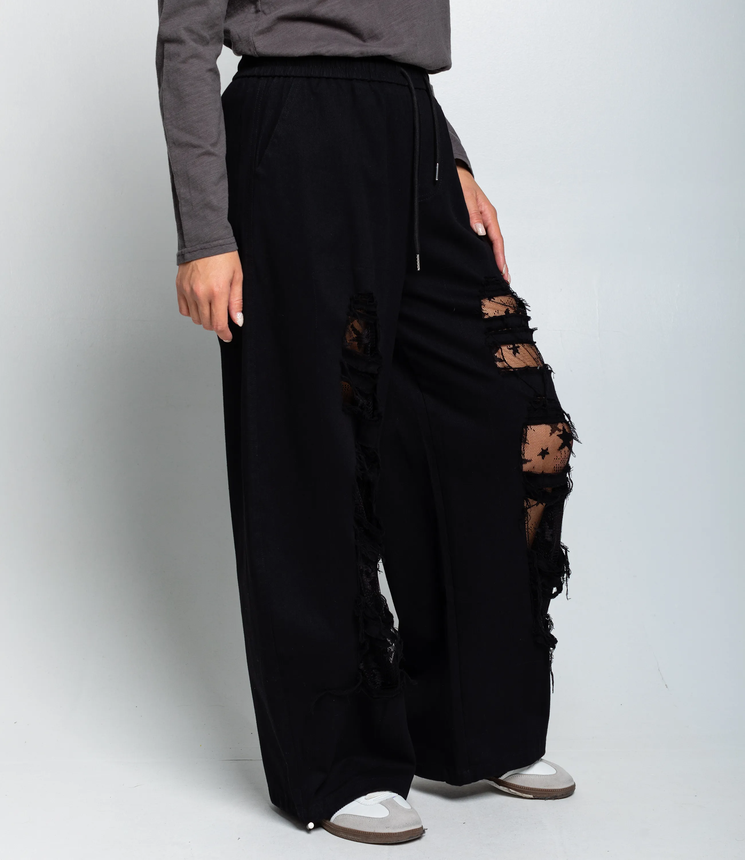 Брюки — это часть гардероба, которая подчёркивает уникальность и стиль каждой покупательницы. Модель выполнена в свободном широком крое с эластичным поясом и утягивающим шнурком, что обеспечивает комфортную посадку и универсальность при выборе размеров. Декоративной особенностью являются крупные рваные отверстия на передней части, под которыми видна прозрачная сетка с узором в виде звёзд — такой акцент придаёт изделию оригинальный, модный характер и вписывается в городские повседневные и гранж‑образы. Брюки оснащены боковыми карманами, что повышает их практичность в повседневной носке. Для пошива использована ткань 80% хлопок, 20% полиэстер: хлопок обеспечивает комфорт, приятные тактильные ощущения и хорошую воздухопроницаемость, полиэстер добавляет прочности, уменьшает усадку и помогает сохранять форму при активной носке и стирках. Комбинация материалов делает модель долговечной и презентабельной даже при интенсивной эксплуатации, что снижает процент рекламаций и возвратов. Для оптовых покупателей это привлекательная и оборотистая позиция: актуальный дизайн и универсальный крой упрощают формирование размерного ряда, а выразительные декоративные элементы повышают привлекательность товара на витрине. Рекомендуем включать модель в тематические подборки «streetwear» и «casual», комбинировать с базовыми футболками, худи и куртками для увеличения среднего чека, предлагать наборы ключевых размеров и наборы оттенков для ускорения оборачиваемости. Цвета и фактура соответствуют фотографиям в карточке товара; на странице размещена подробная таблица размеров для точного подбора.