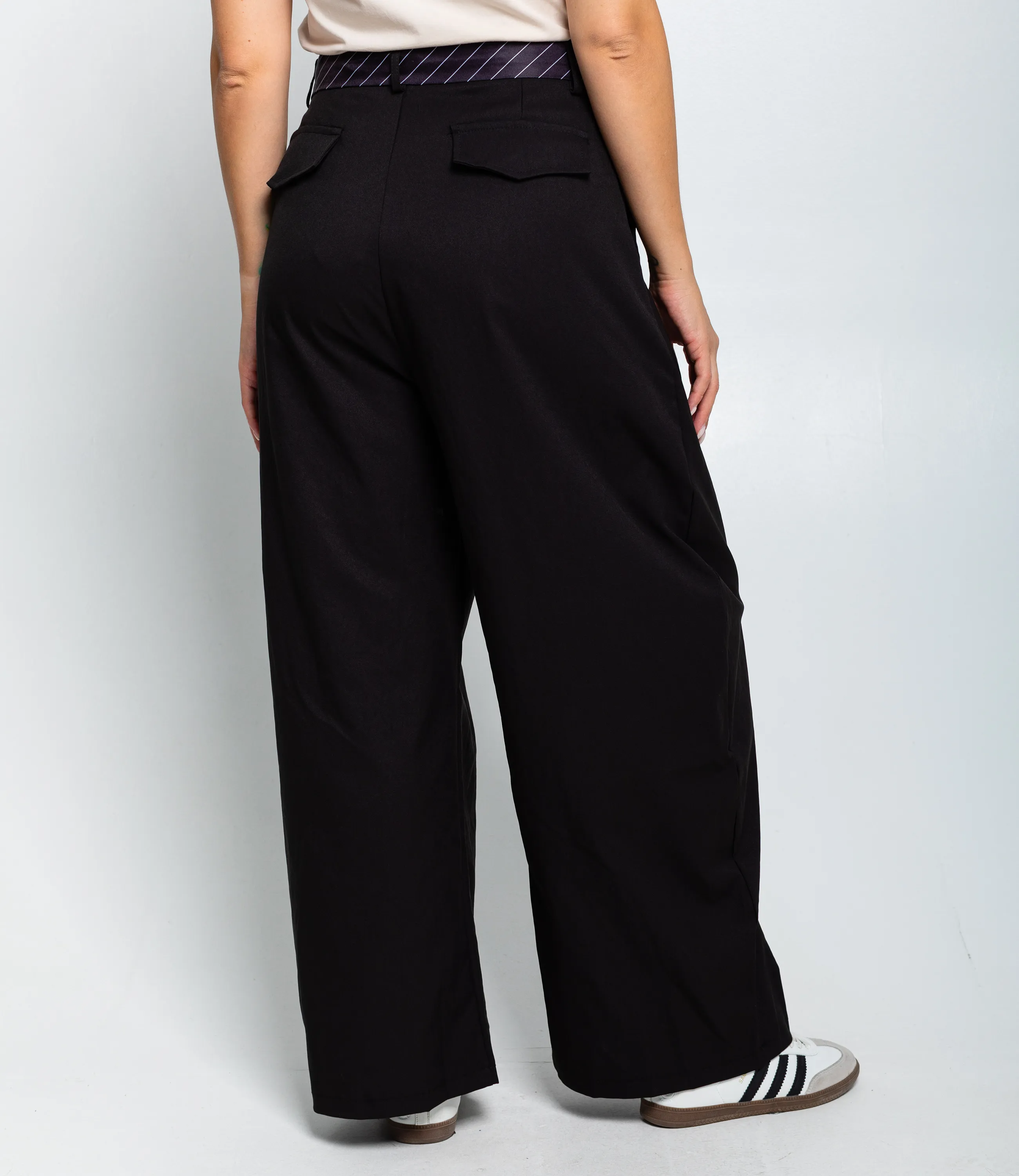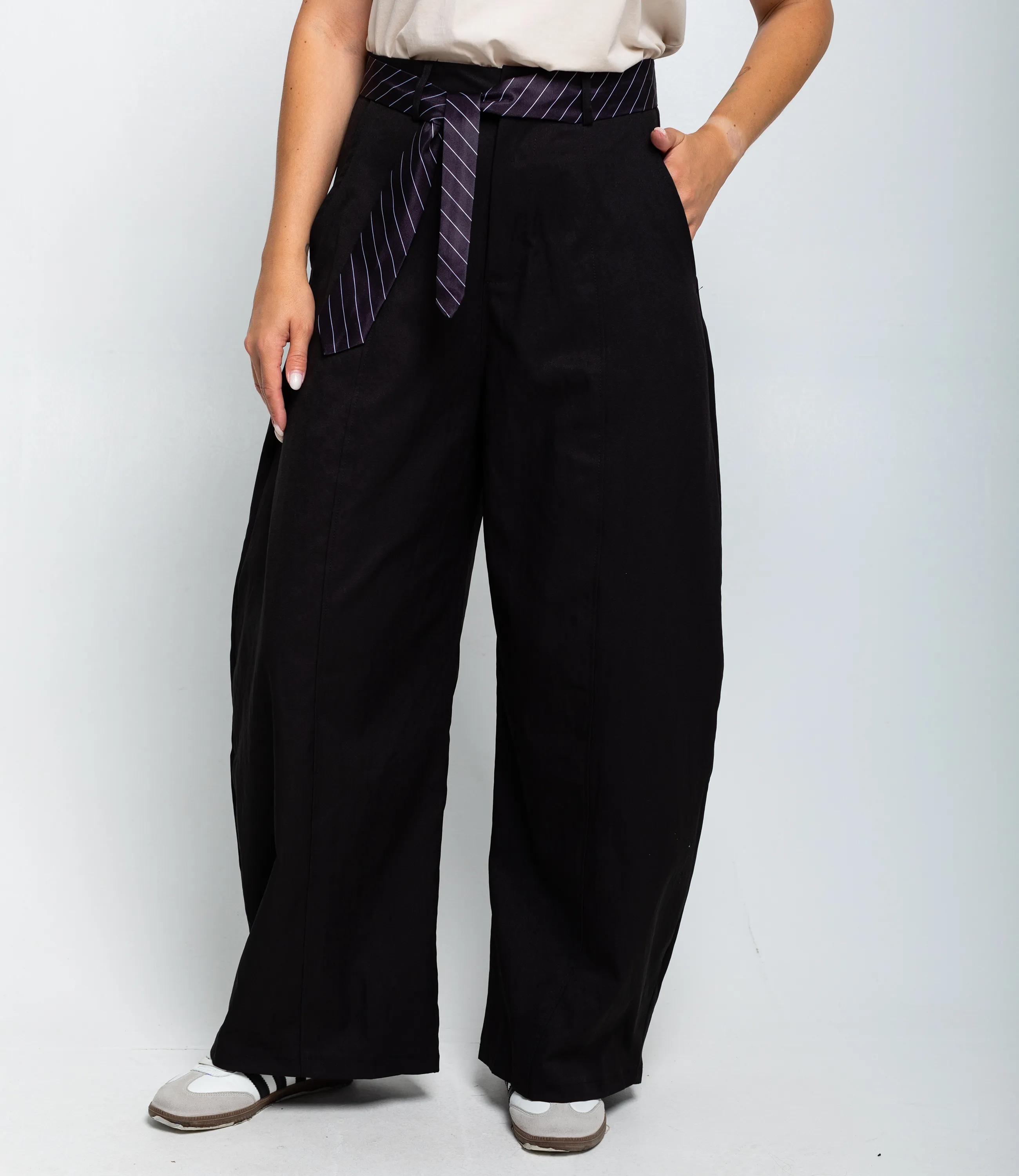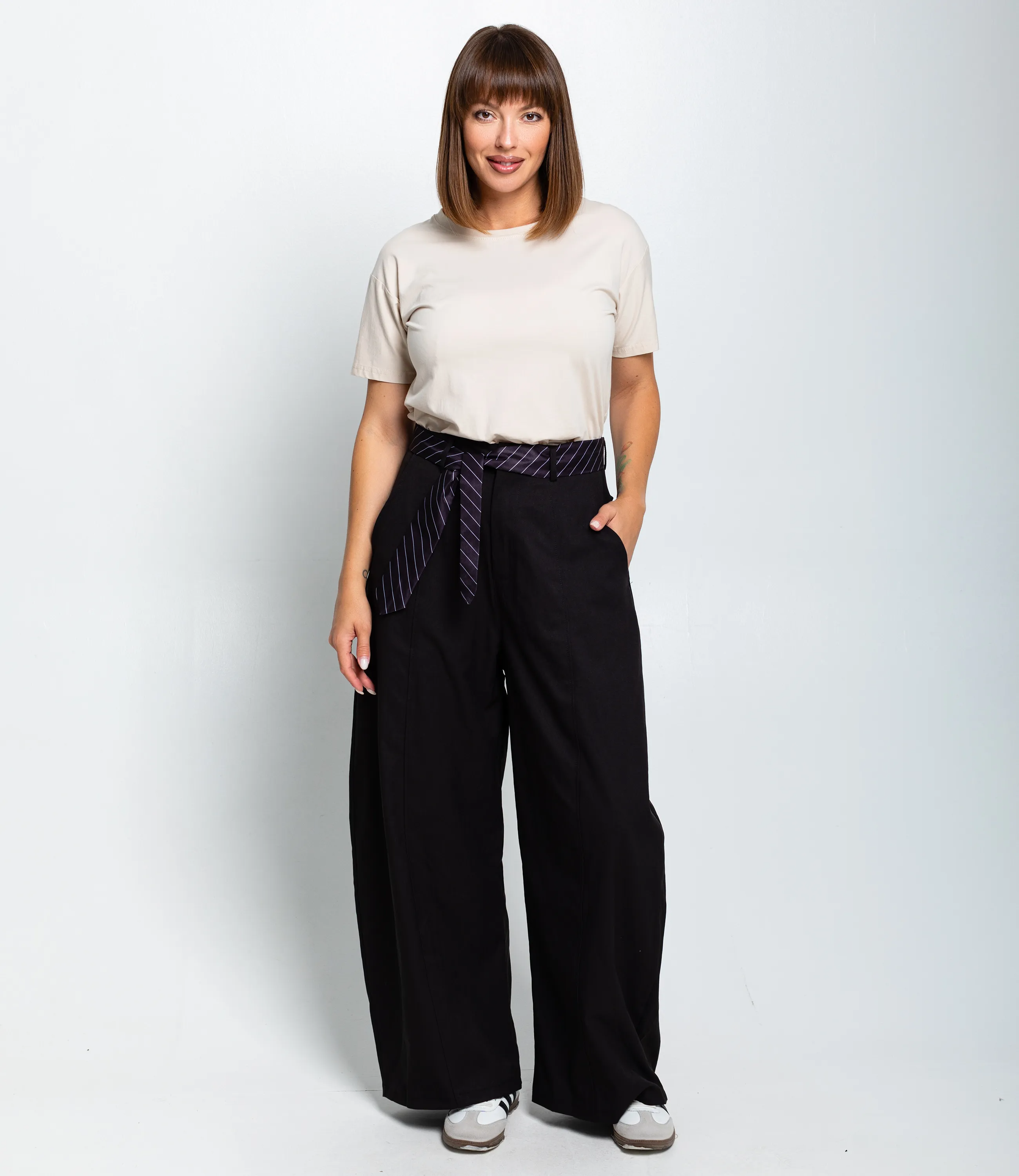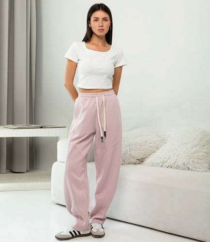 Брюки — это незаменимый элемент гардероба, который подчеркивает стиль и индивидуальность каждой женщины. имеют высокий пояс с втачным пояском, на котором лежит декоративный длинный пояс‑шнур, продетый через петли и завязанный спереди, создавая акцент в талии. Фасон свободный, широкие прямые штанины от бедра до низа, с лёгкой драпировкой по бокам и вертикальными центральными швами на каждой штанине, придающими стройность линии. Низ брюк прямой, без дополнительных манжет, обработан простым подшивом. Состав: 65% полиэстер, 30% хлопок, 5% эластан. Обратите внимание на современный крой и удобную посадку, которые ваши покупатели оценят по достоинству. Мы также предоставили таблицу размеров на нашем сайте, чтобы все могли выбрать идеальный вариант. Наша цена является приемлемой для оптовых покупателей, что делает эту модель отличным дополнением к вашему ассортименту. Дайте вашим клиентам возможность выглядеть стильно и чувствовать себя комфортно с этими брюками, ведь каждая женщина заслуживает выражать свой индивидуальный стиль!