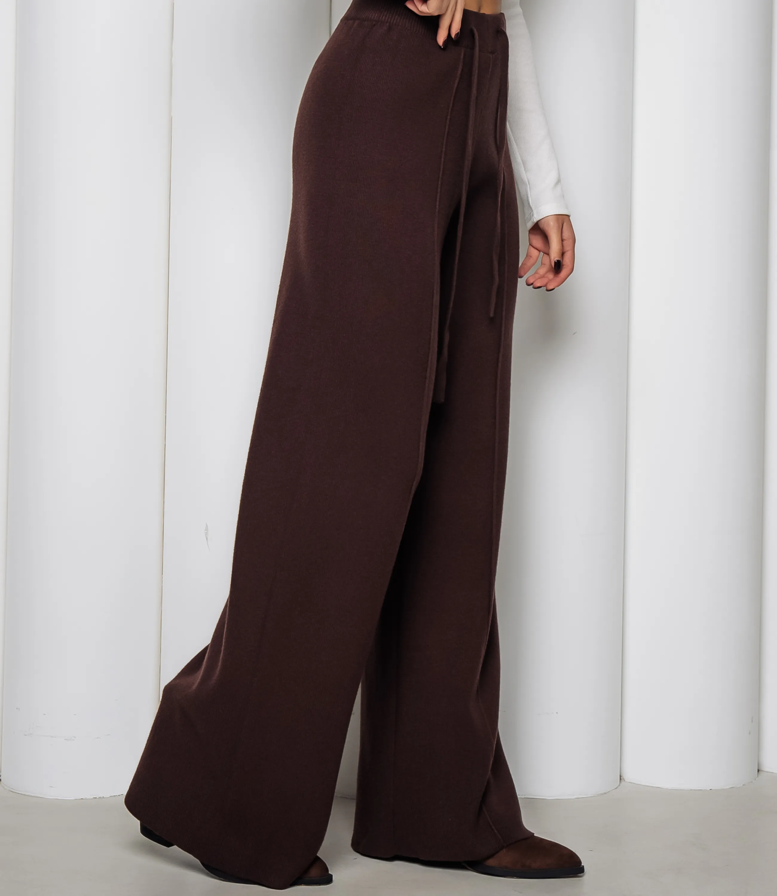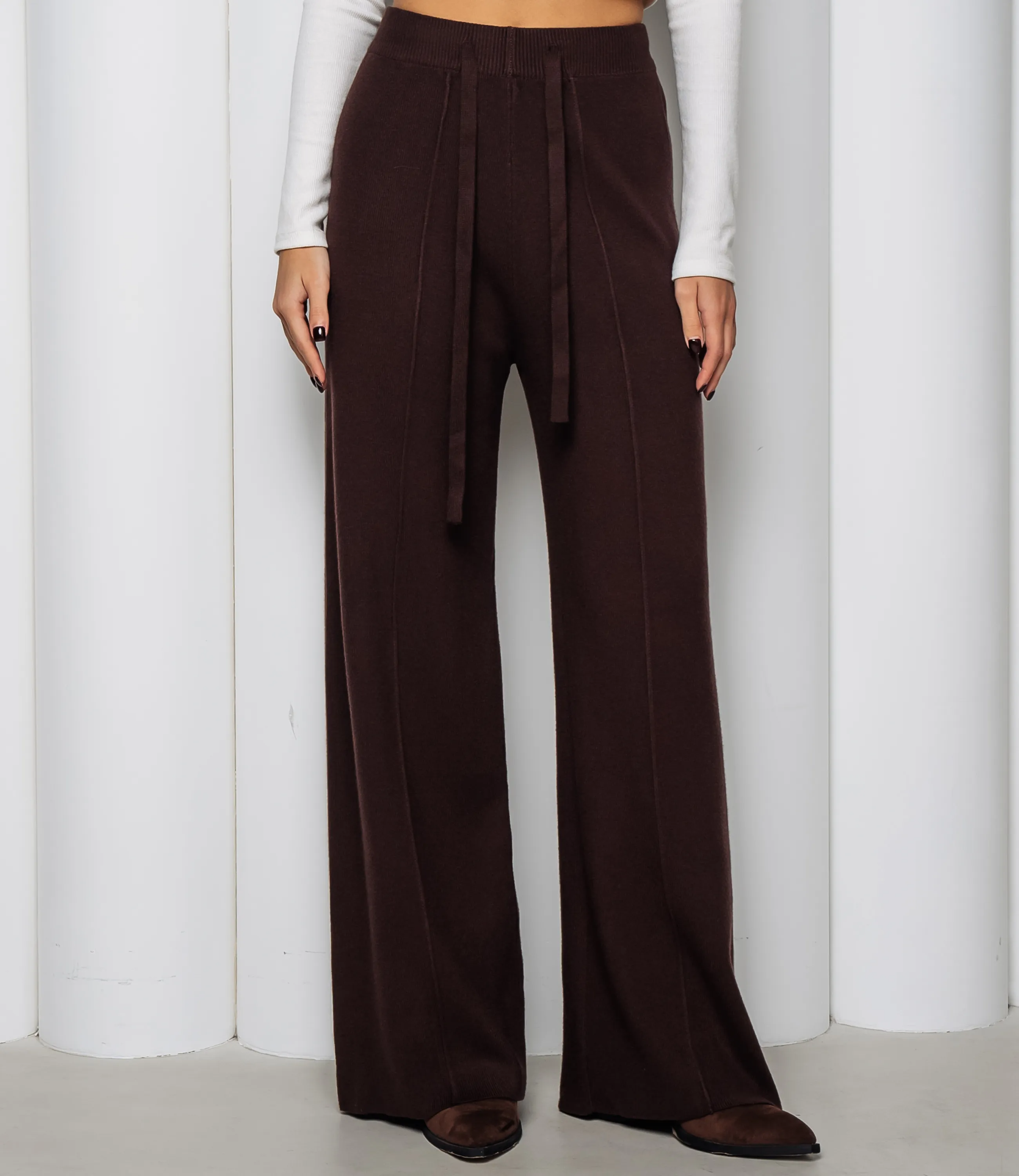 Брюки — это вещь, которая подчеркивает привлекательность и универсальность гардероба ваших покупательниц. Брюки выполнены в свободном прямом крое с широкими штанинами, длина до пола с лёгким запасом у низа, создающим прямой удлинённый силуэт. Талия средней посадки на широком вязаном эластичном поясе с внутренней кулиской и декоративными, но функциональными шнурками, свисающими спереди. Передняя часть модели оформлена вертикальными рельефными швами, проходящими от пояса вниз по центру каждой штанини, что визуально удлиняет ноги и придаёт изделию структурированность. Боковые карманы врезного типа аккуратно вшиты в боковые швы, без выступающих элементов; шаговый шов и все внешние швы выполнены декоративной прострочкой, подчёркивающей геометрию кроя. Для пошива использована ткань 65% хлопка, 35% полиэстера, отличающаяся отменным качеством. Даже после многочисленных стирок изделие не утратит первоначальной привлекательности и сохраняет форму. Цвет соответствует фотографии на сайте и отличается насыщенностью, что облегчает продажу и удовлетворяет ожидания покупательниц. Мы представили таблицу размеров на странице, чтобы вы могли легко подобрать ассортимент под потребности клиентов и избежать возвратов. Производитель уделяет внимание современным, стильным решениям и качественной отделке, что делает эту модель выгодной для оптовых закупок. Установленная оптовая цена является адекватной и обеспечивает хорошую маржинальность при продаже в магазинах. Рекомендуем включить брюки в ассортимент — они привлекут покупательниц, ценящих сочетание качества и презентабельного внешнего вида! Рост модели 168 см., 89-63-90.