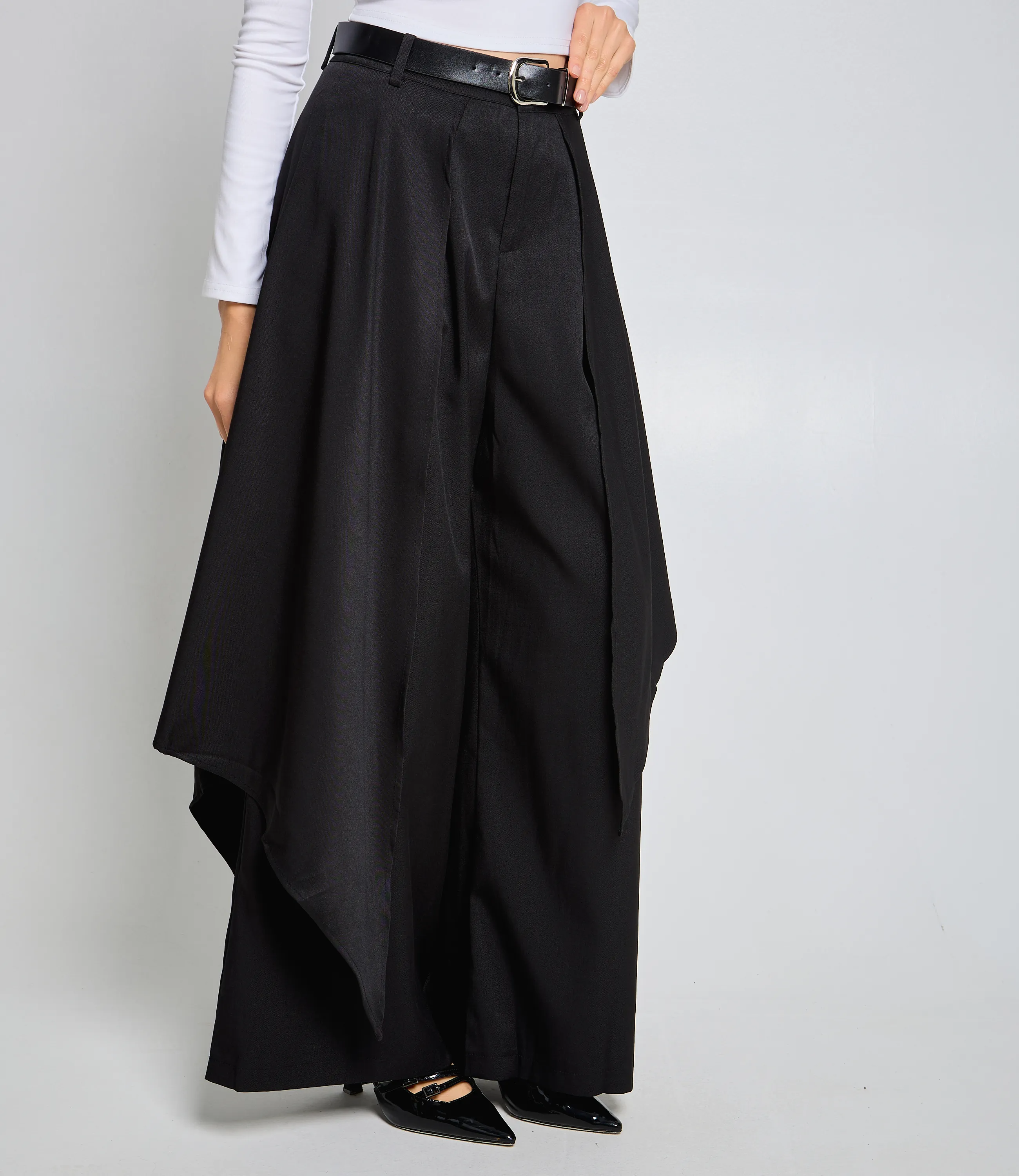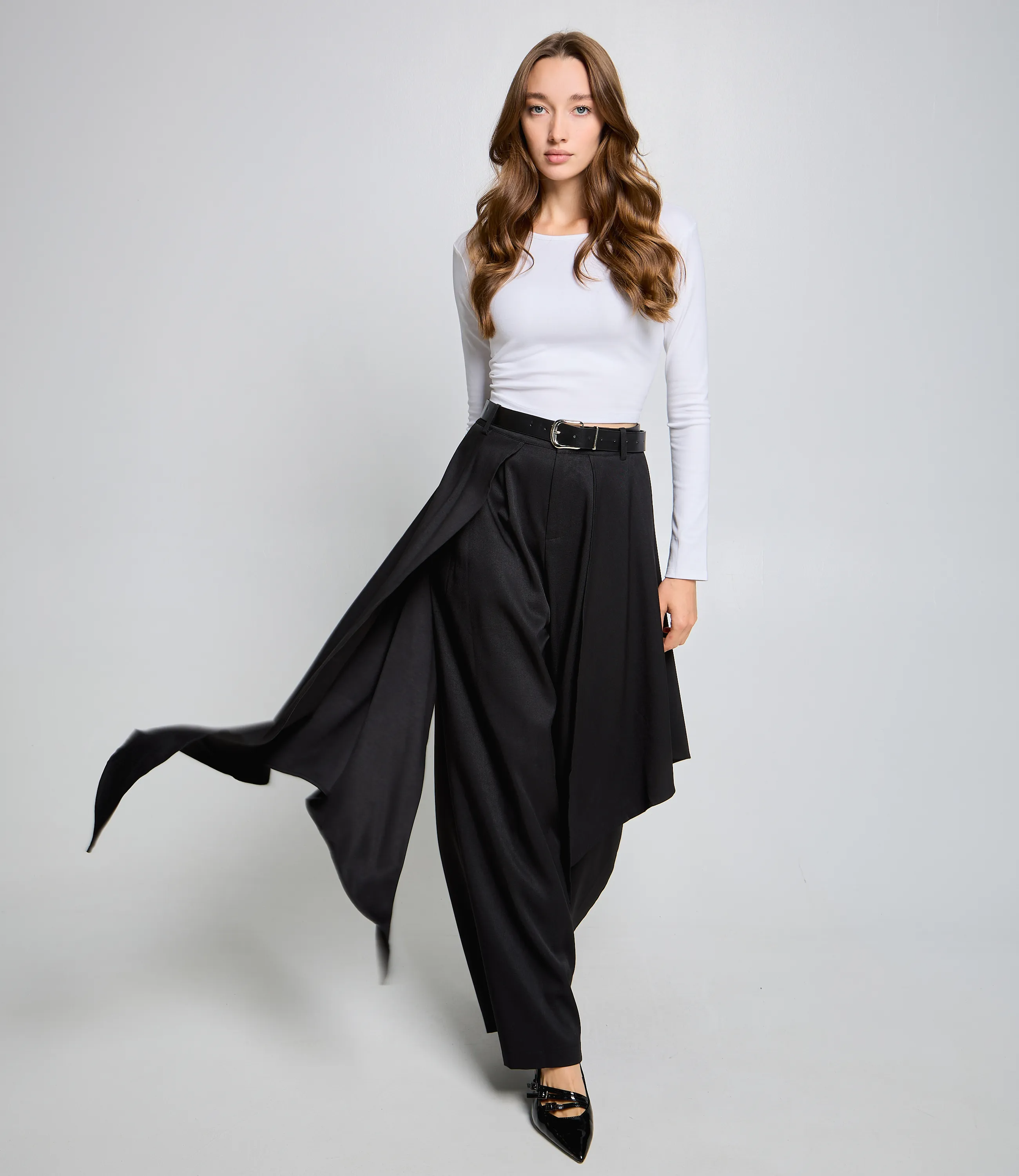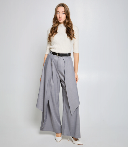Брюки — это часть гардероба, которая подчёркивает уникальность и стиль каждой покупательницы.Брюки с высокой талией и свободным, слегка расширенным силуэтом, прямыми брючинами, которые сохраняют линию от бёдер до щиколотки; широкий пояс со шлевками для ремня и скрытой застёжкой спереди, виден ремень с пряжкой; передняя часть украшена крупными встречными складками от пояса, придающими объём в области бёдер и мягко рассеивающими ткань вниз, боковые швы гладкие, карманы, вероятно, скрытые в швах. Для пошива использована ткань 80% полиэстер, 20% хлопок: хлопок обеспечивает комфорт, приятные тактильные ощущения и хорошую воздухопроницаемость, полиэстер добавляет прочности, уменьшает усадку и помогает сохранять форму при активной носке и стирках. Комбинация материалов делает модель долговечной и презентабельной даже при интенсивной эксплуатации, что снижает процент рекламаций и возвратов. Для оптовых покупателей это привлекательная и оборотистая позиция: актуальный дизайн и универсальный крой упрощают формирование размерного ряда, а выразительные декоративные элементы повышают привлекательность товара на витрине. Рост модели: 168, параметры: 85-63-92.